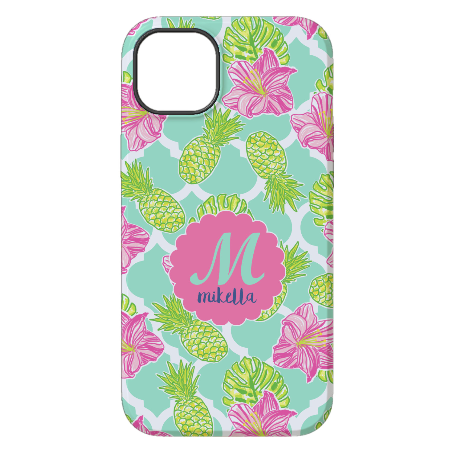 The background is a mint and white Moroccan lattice with brightly colored hibiscus flowers and pineapples. A scalloped frame sits in the center of the design with a fun name and initial personalization. With all of the fun bright yellows, greens, and pinks, you will just fawn over this design.
