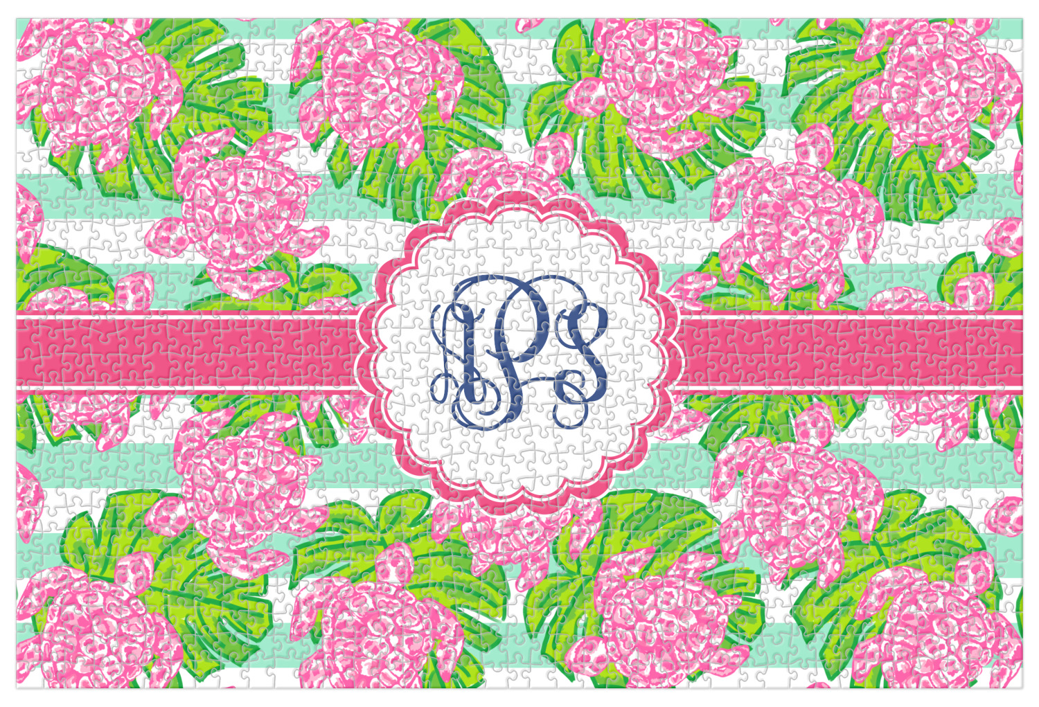 Looking for something Preppy? This design has gorgeous flashy pinks and greens and, of course, monograms! The main design is layered with mint & white stripes, beautiful green leaves and some adorable pink turtles. This will be the perfect design for a typical college girl!
