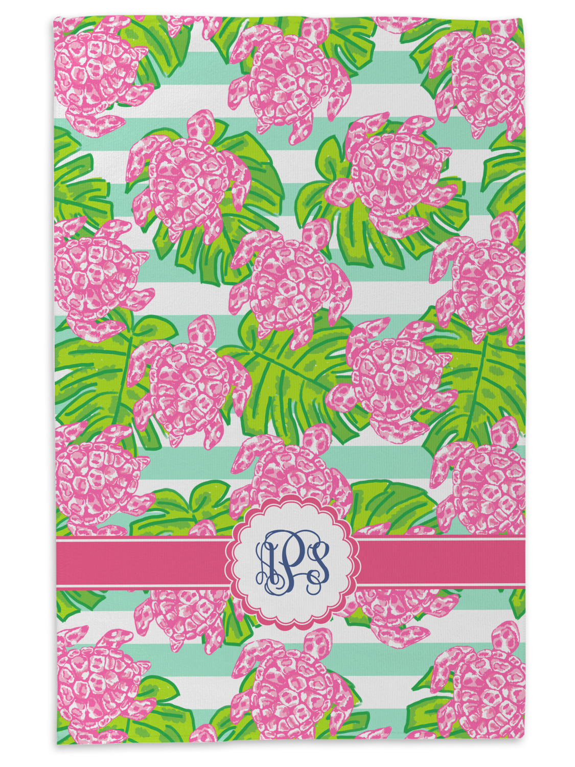 Looking for something Preppy? This design has gorgeous flashy pinks and greens and, of course, monograms! The main design is layered with mint & white stripes, beautiful green leaves and some adorable pink turtles. This will be the perfect design for a typical college girl!
