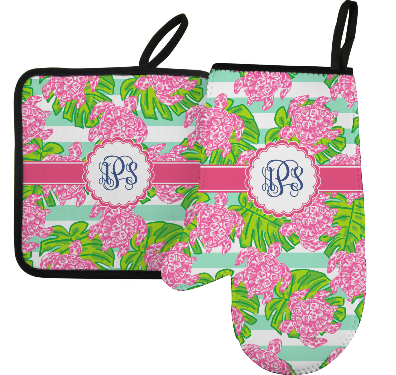 Looking for something Preppy? This design has gorgeous flashy pinks and greens and, of course, monograms! The main design is layered with mint & white stripes, beautiful green leaves and some adorable pink turtles. This will be the perfect design for a typical college girl!