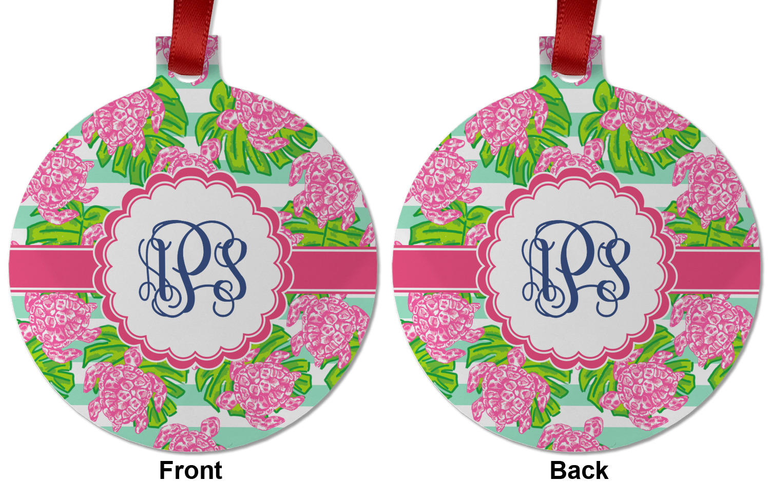 Looking for something Preppy? This design has gorgeous flashy pinks and greens and, of course, monograms! The main design is layered with mint & white stripes, beautiful green leaves and some adorable pink turtles. This will be the perfect design for a typical college girl!