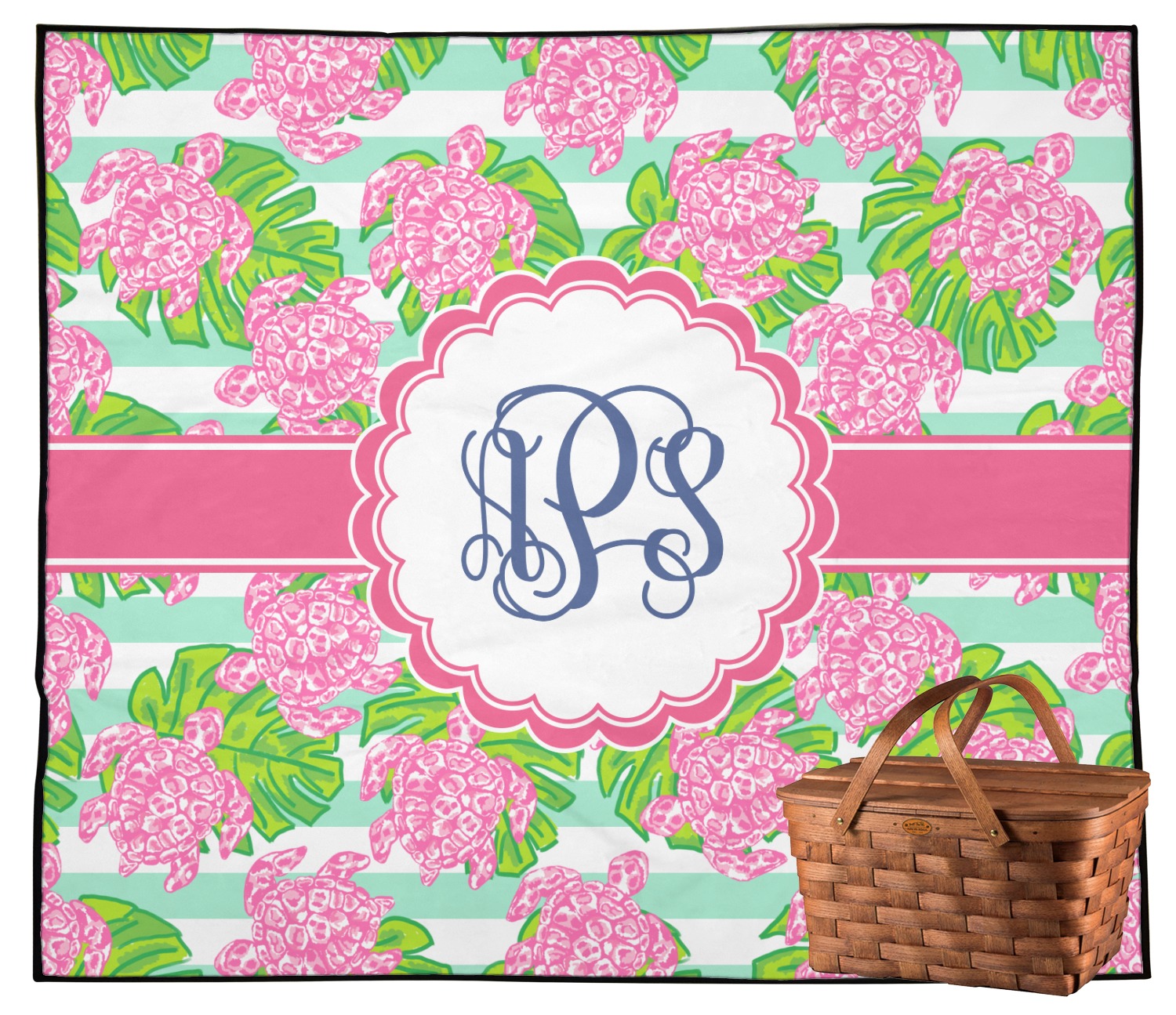Looking for something Preppy? This design has gorgeous flashy pinks and greens and, of course, monograms! The main design is layered with mint & white stripes, beautiful green leaves and some adorable pink turtles. This will be the perfect design for a typical college girl!