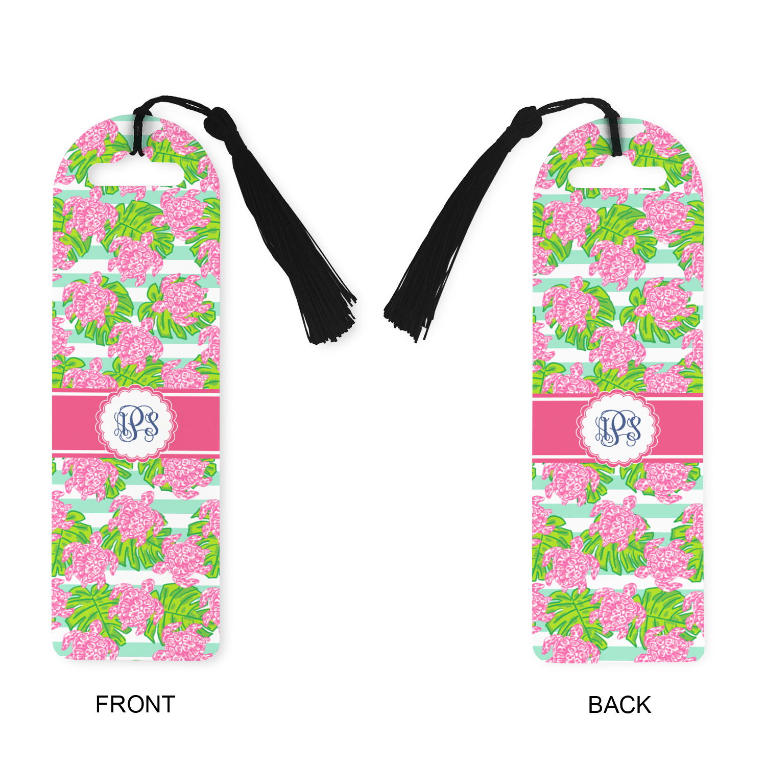 Made from a durable, flexible plastic, these bookmarks are printed with your custom design on them. With the tassel on them they make it easy to find your page in your book. These are a rectangular shape 7 1/4 inches tall with a rounded top and are approximately 2 1/4 inches wide.