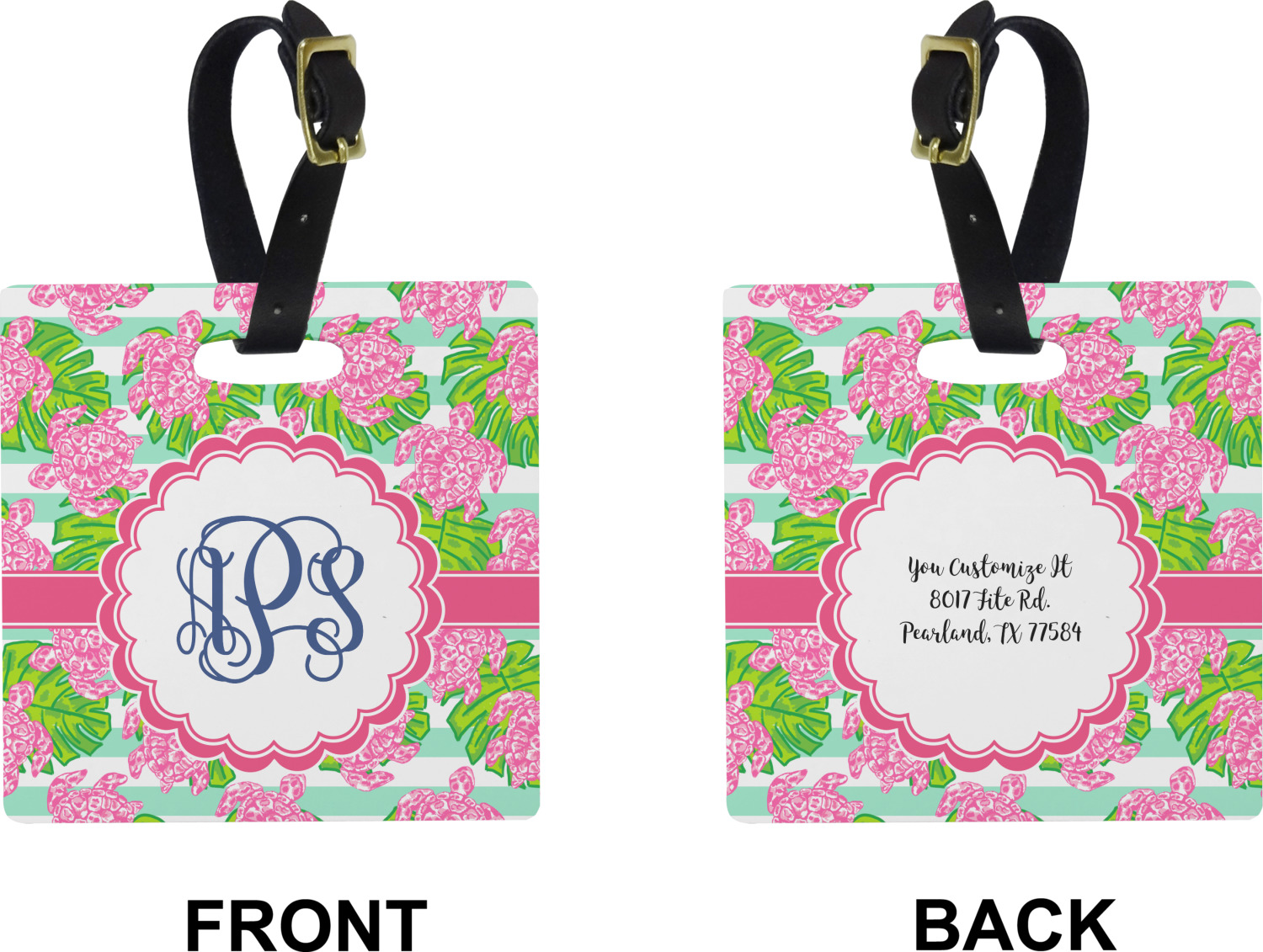 These personalized bag tags are sold in a variety of shapes, so that you may find the product that meets your vision exactly. We sell a round luggage tag, which measures at approximately 4" x 4". Our square luggage tag is about 3.5" x 3.5", while our rectangular version is 2.75" x 4 ".