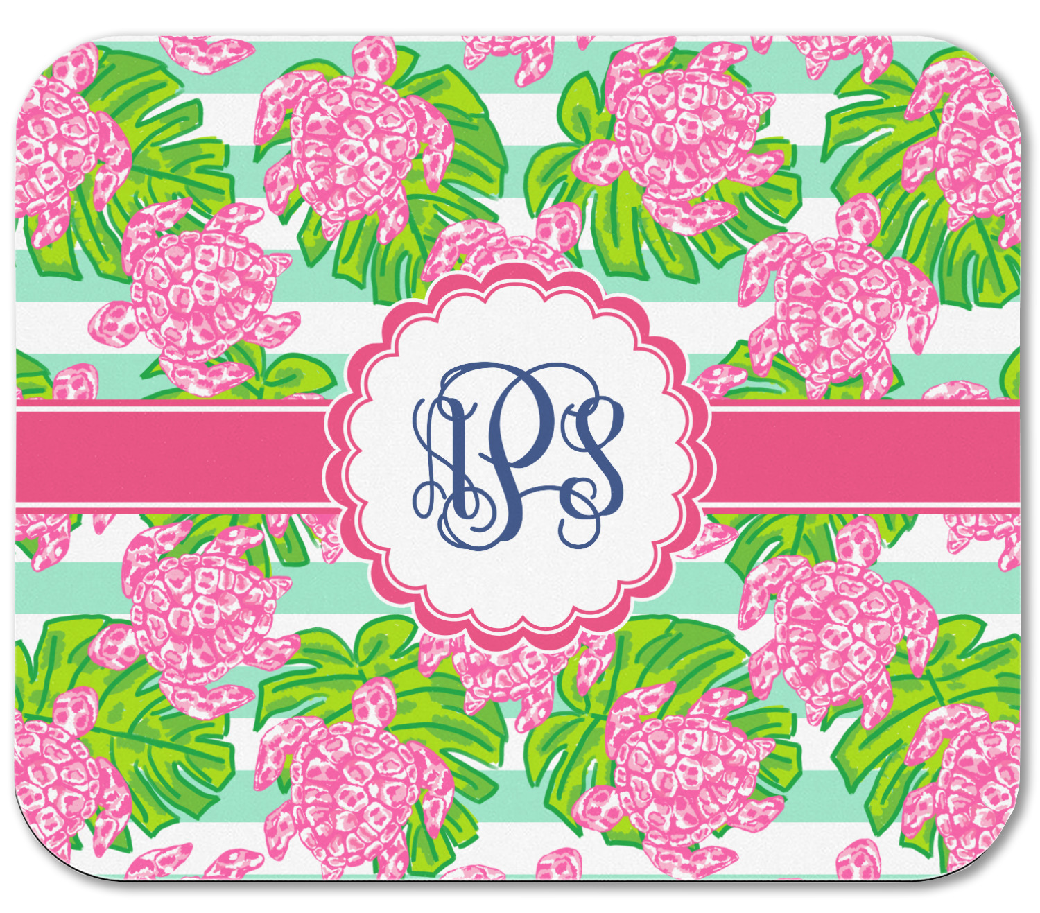 Looking for something Preppy? This design has gorgeous flashy pinks and greens and, of course, monograms! The main design is layered with mint & white stripes, beautiful green leaves and some adorable pink turtles. This will be the perfect design for a typical college girl!