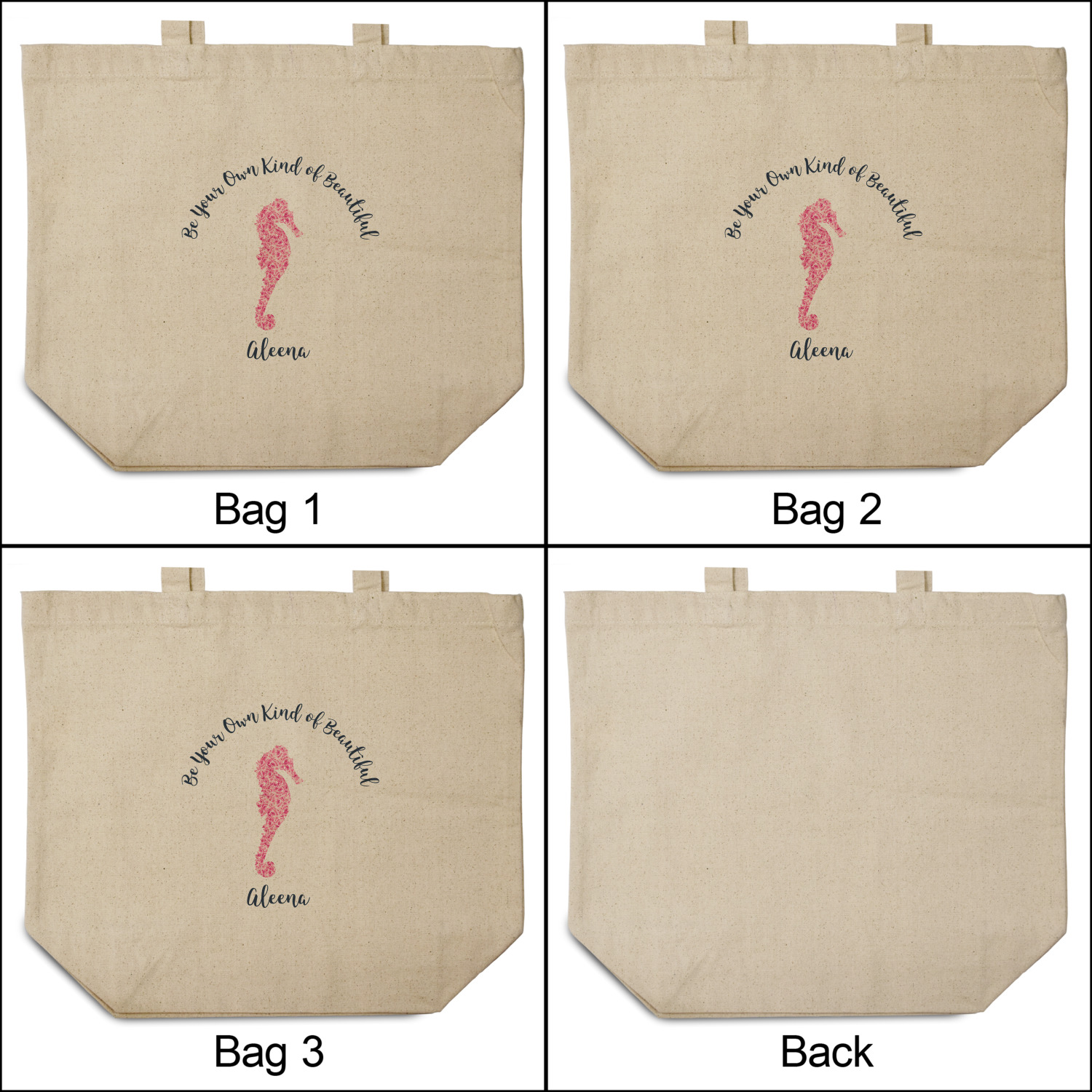 These cotton totes are washable and easy to care for, and they can be folded flat for storage. Your artwork, logo, or photo is printed in full color directly on the cotton tote in the front.