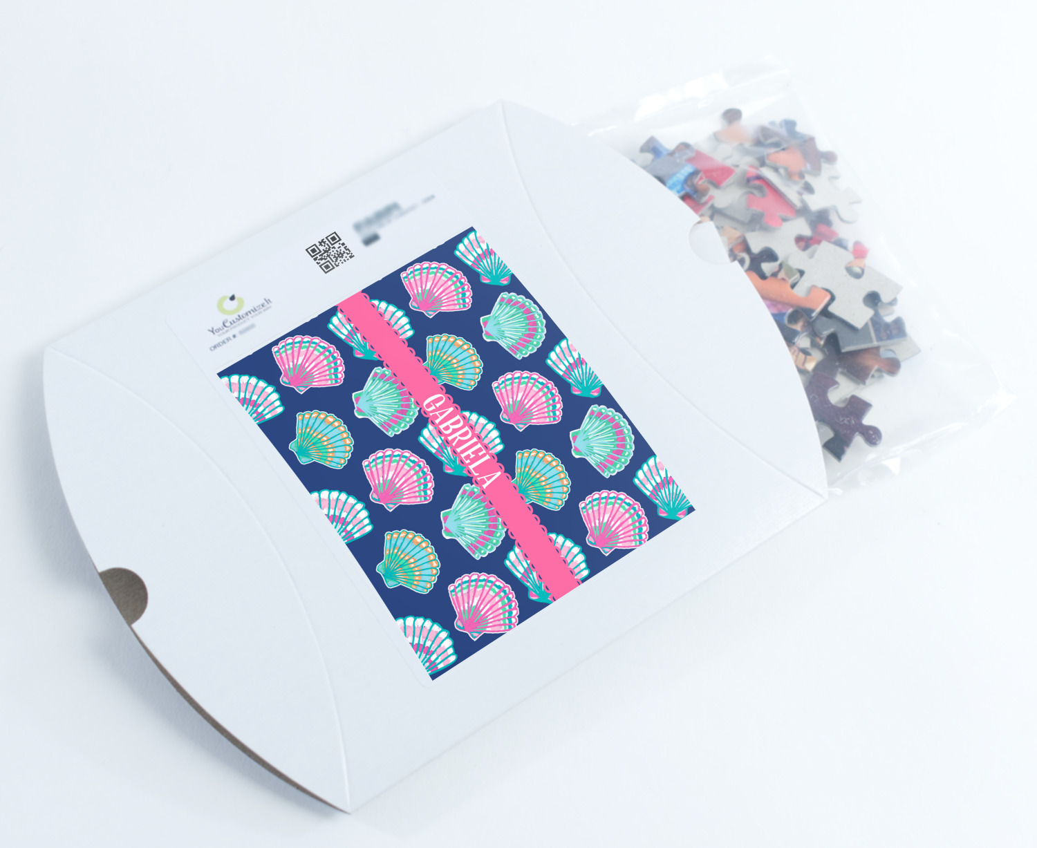 In this design, light pink and teal shells are randomly arranged on a blue background to create a stunning pattern. The main design uses a scalloped ribbon with a name for personalization. The coordinating pattern is filled with overlapping teal and pink shells.