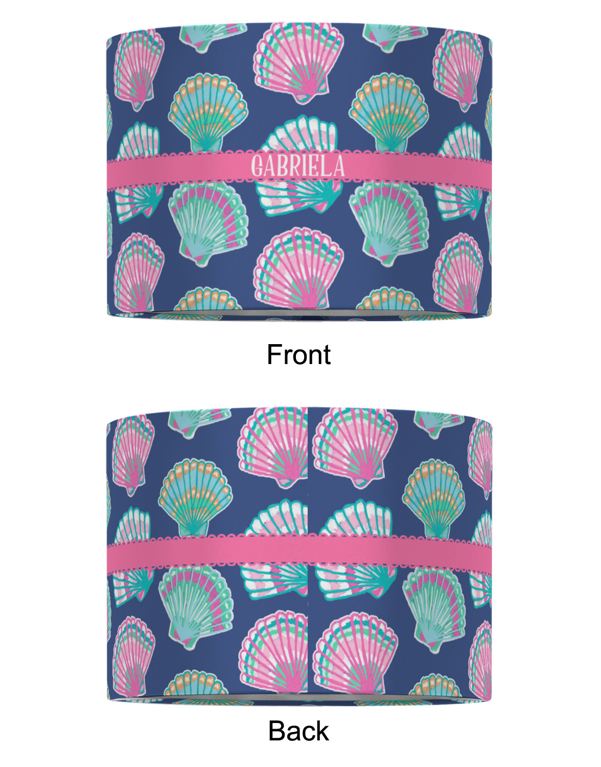 In this design, light pink and teal shells are randomly arranged on a blue background to create a stunning pattern. The main design uses a scalloped ribbon with a name for personalization. The coordinating pattern is filled with overlapping teal and pink shells.