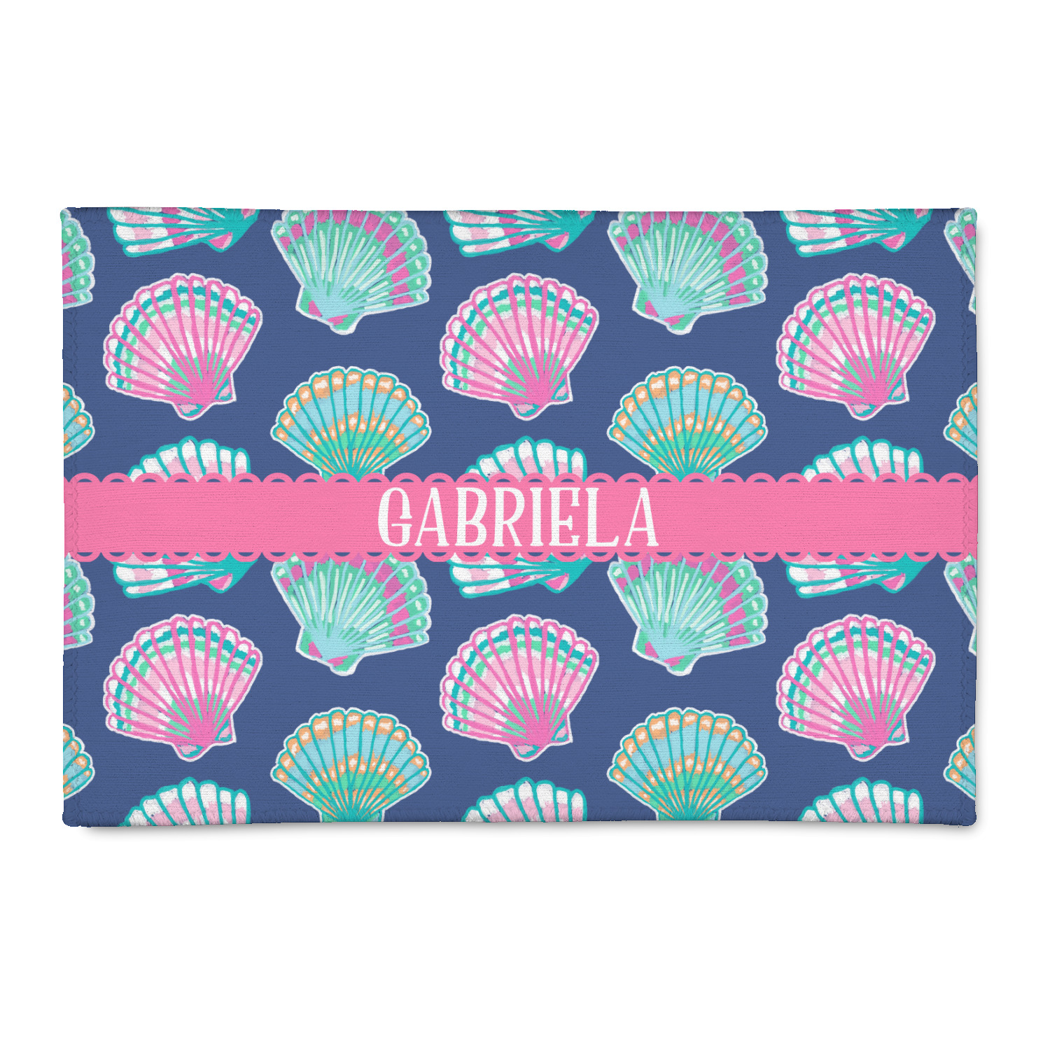 In this design, light pink and teal shells are randomly arranged on a blue background to create a stunning pattern. The main design uses a scalloped ribbon with a name for personalization. The coordinating pattern is filled with overlapping teal and pink shells.