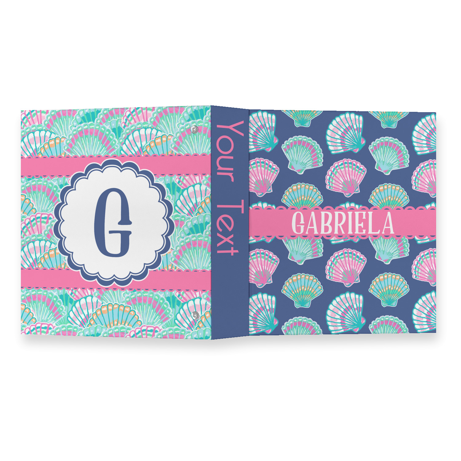 In this design, light pink and teal shells are randomly arranged on a blue background to create a stunning pattern. The main design uses a scalloped ribbon with a name for personalization. The coordinating pattern is filled with overlapping teal and pink shells.