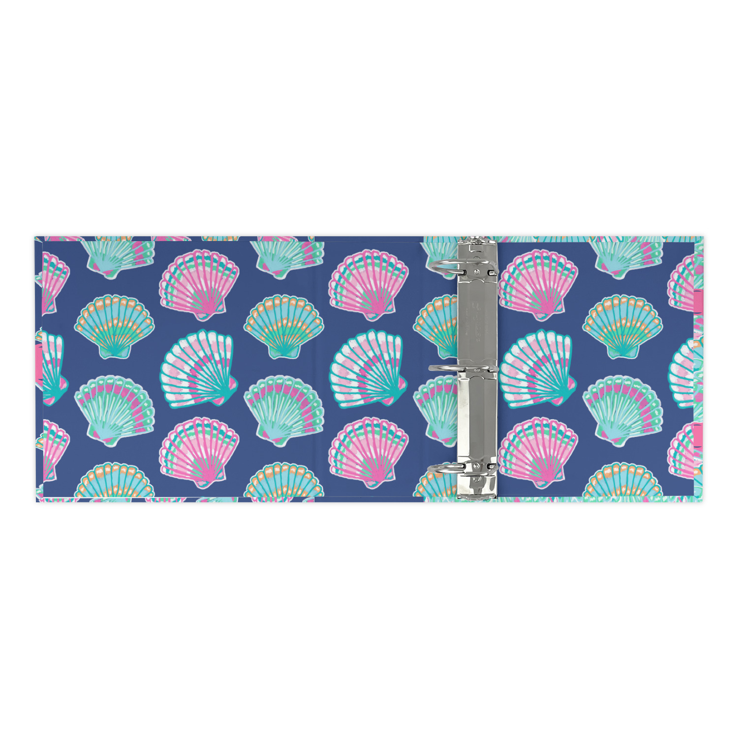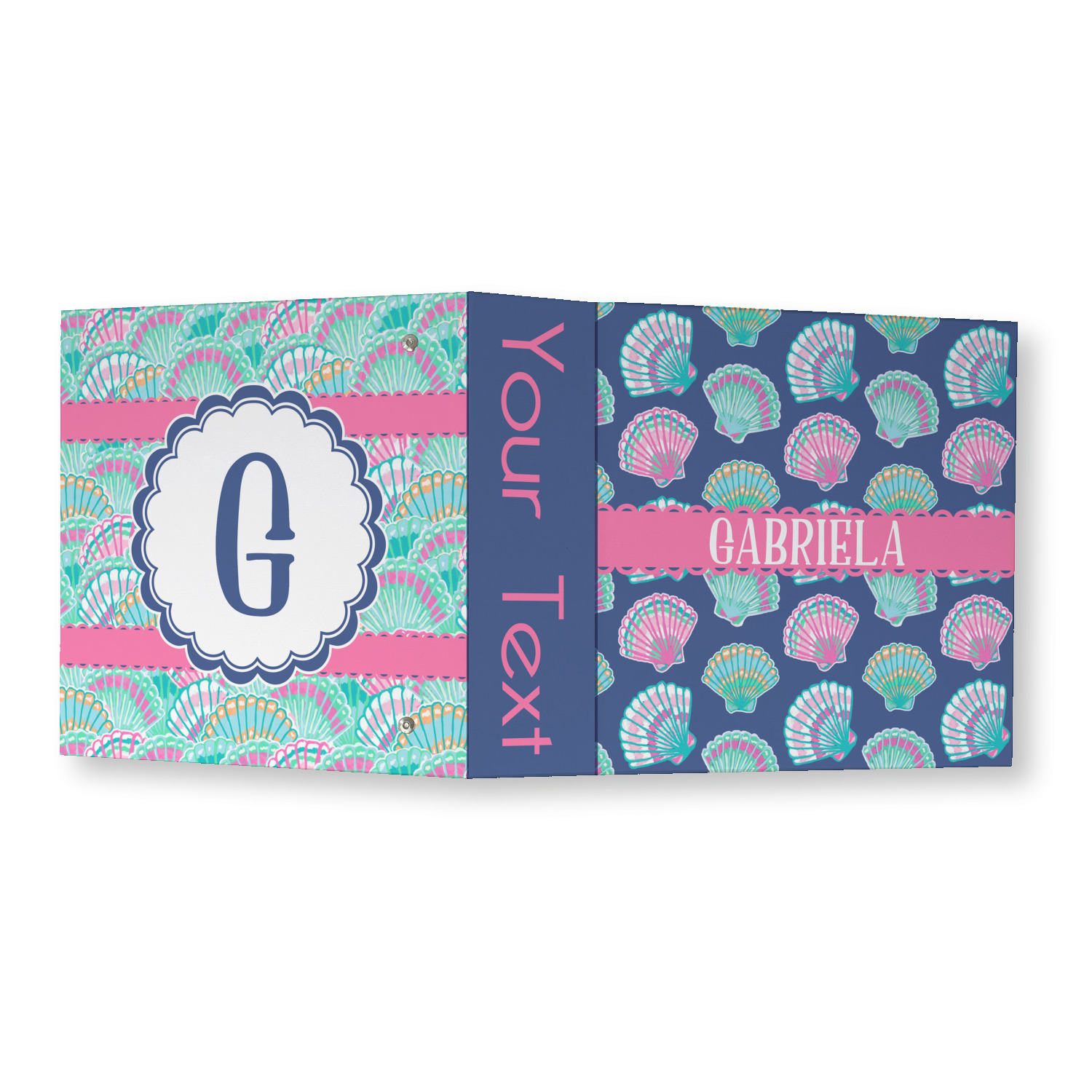 In this design, light pink and teal shells are randomly arranged on a blue background to create a stunning pattern. The main design uses a scalloped ribbon with a name for personalization. The coordinating pattern is filled with overlapping teal and pink shells.