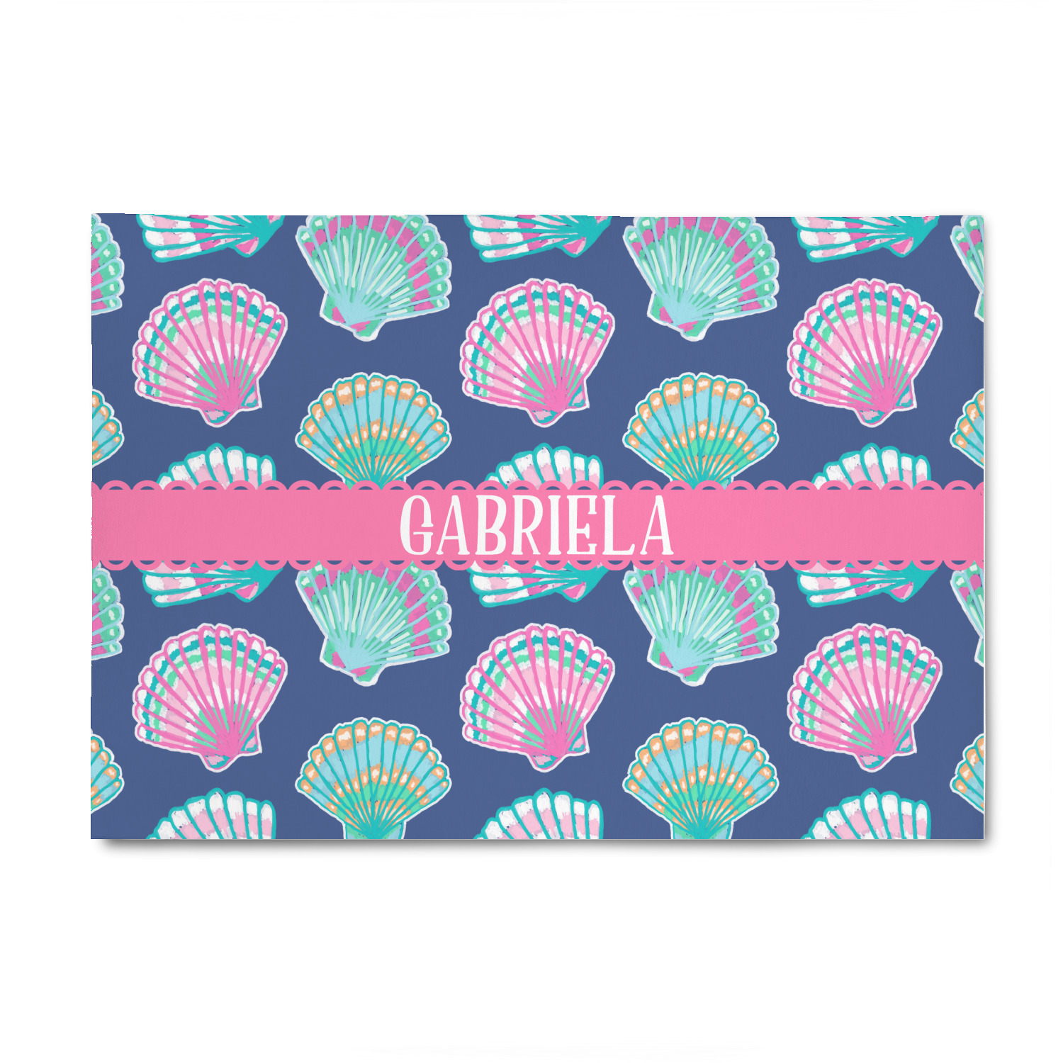 In this design, light pink and teal shells are randomly arranged on a blue background to create a stunning pattern. The main design uses a scalloped ribbon with a name for personalization. The coordinating pattern is filled with overlapping teal and pink shells.