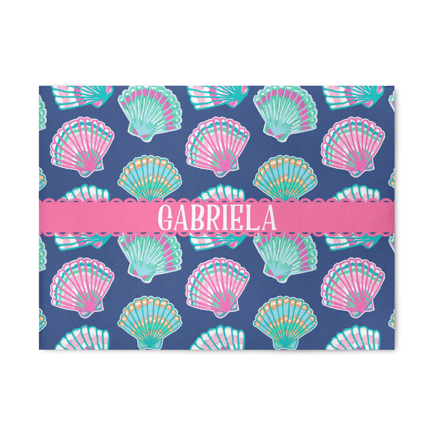 In this design, light pink and teal shells are randomly arranged on a blue background to create a stunning pattern. The main design uses a scalloped ribbon with a name for personalization. The coordinating pattern is filled with overlapping teal and pink shells.