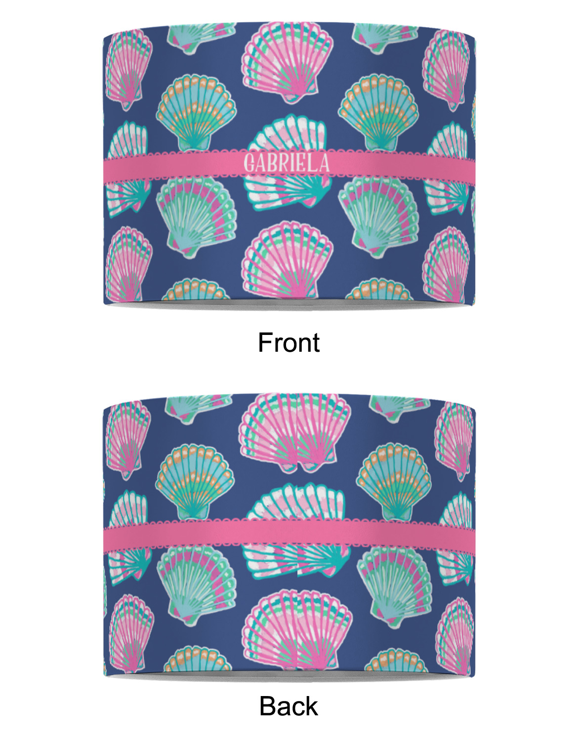 In this design, light pink and teal shells are randomly arranged on a blue background to create a stunning pattern. The main design uses a scalloped ribbon with a name for personalization. The coordinating pattern is filled with overlapping teal and pink shells.