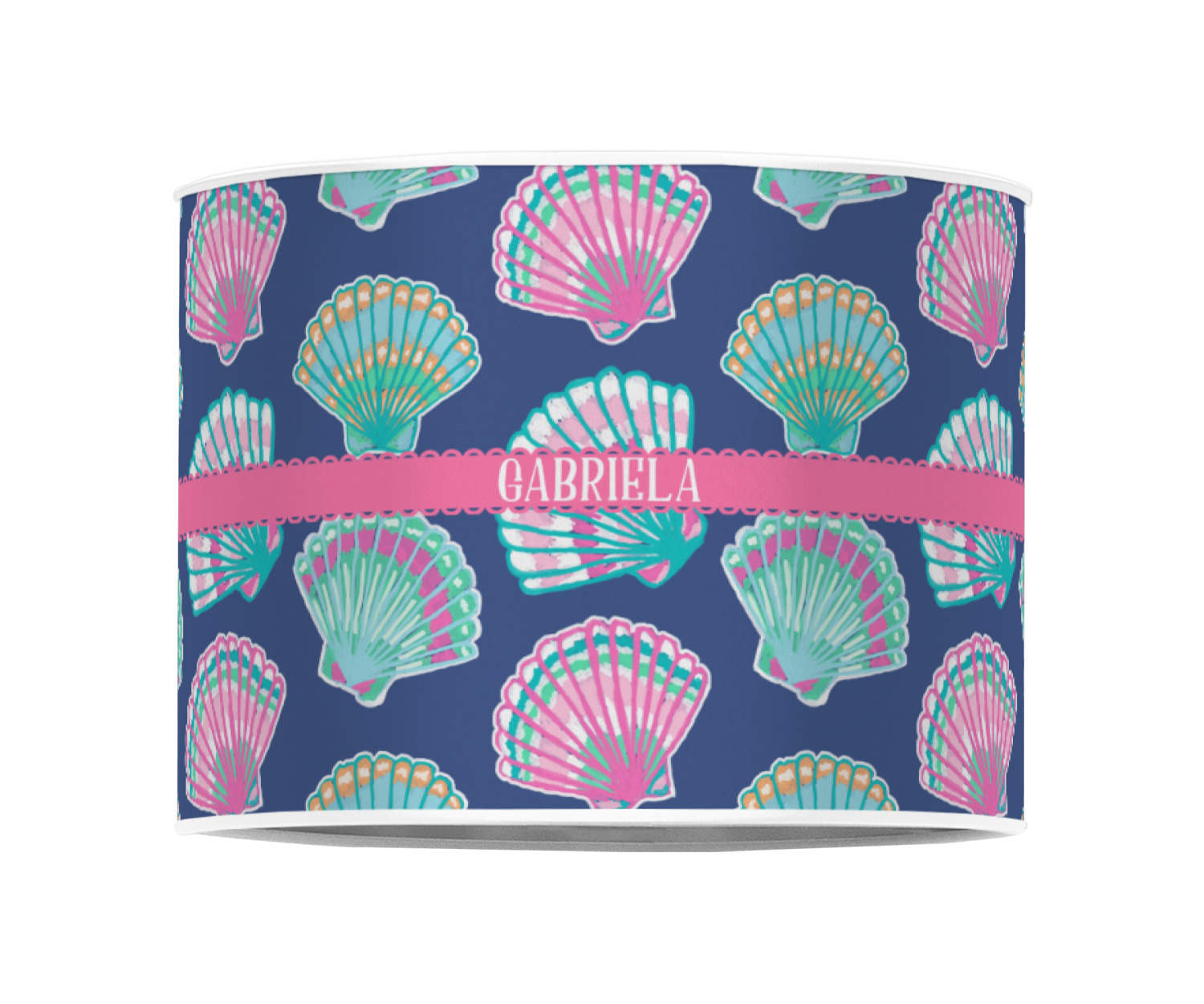 In this design, light pink and teal shells are randomly arranged on a blue background to create a stunning pattern. The main design uses a scalloped ribbon with a name for personalization. The coordinating pattern is filled with overlapping teal and pink shells.
