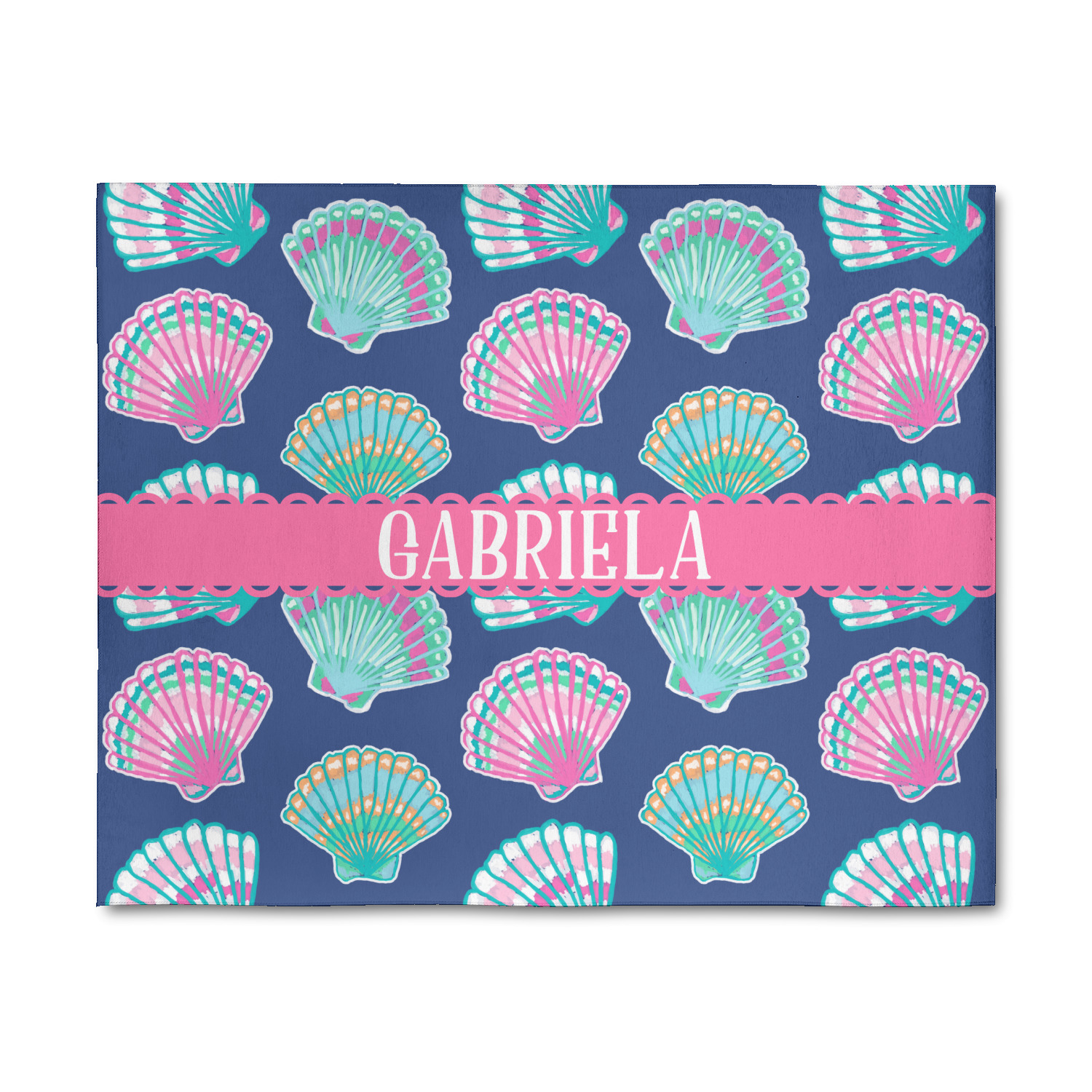 In this design, light pink and teal shells are randomly arranged on a blue background to create a stunning pattern. The main design uses a scalloped ribbon with a name for personalization. The coordinating pattern is filled with overlapping teal and pink shells.