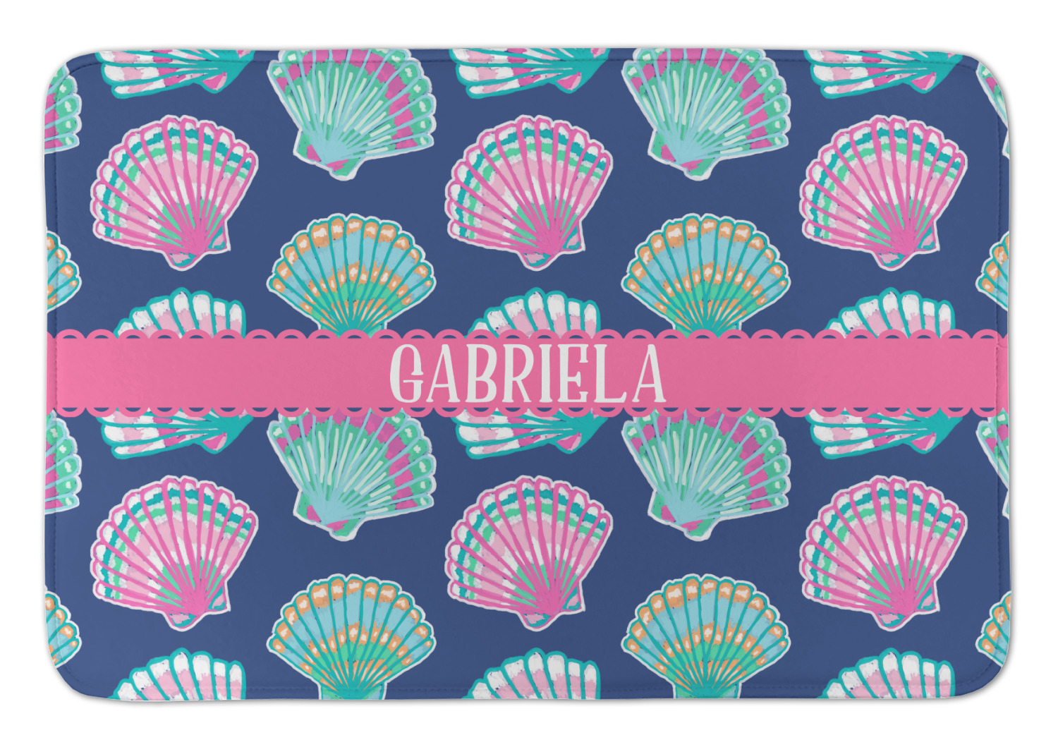In this design, light pink and teal shells are randomly arranged on a blue background to create a stunning pattern. The main design uses a scalloped ribbon with a name for personalization. The coordinating pattern is filled with overlapping teal and pink shells.