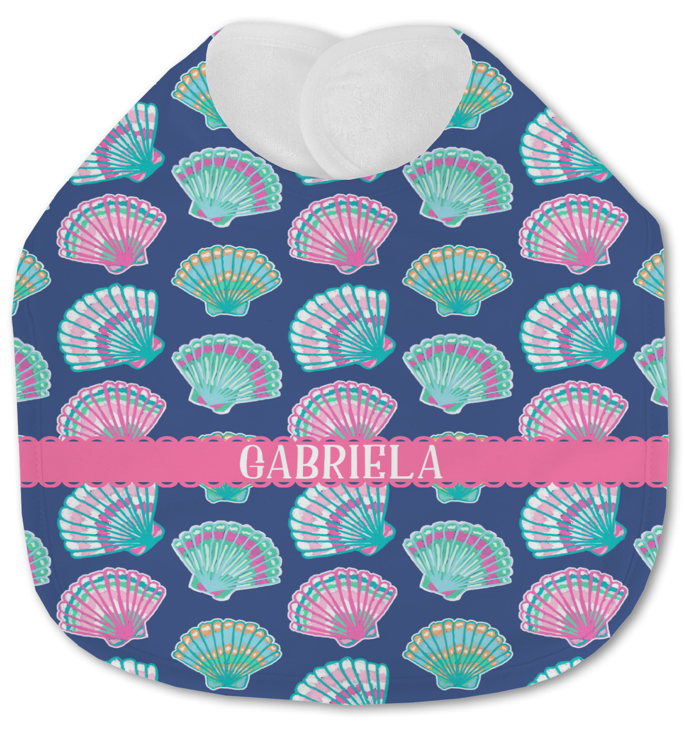 In this design, light pink and teal shells are randomly arranged on a blue background to create a stunning pattern. The main design uses a scalloped ribbon with a name for personalization. The coordinating pattern is filled with overlapping teal and pink shells.