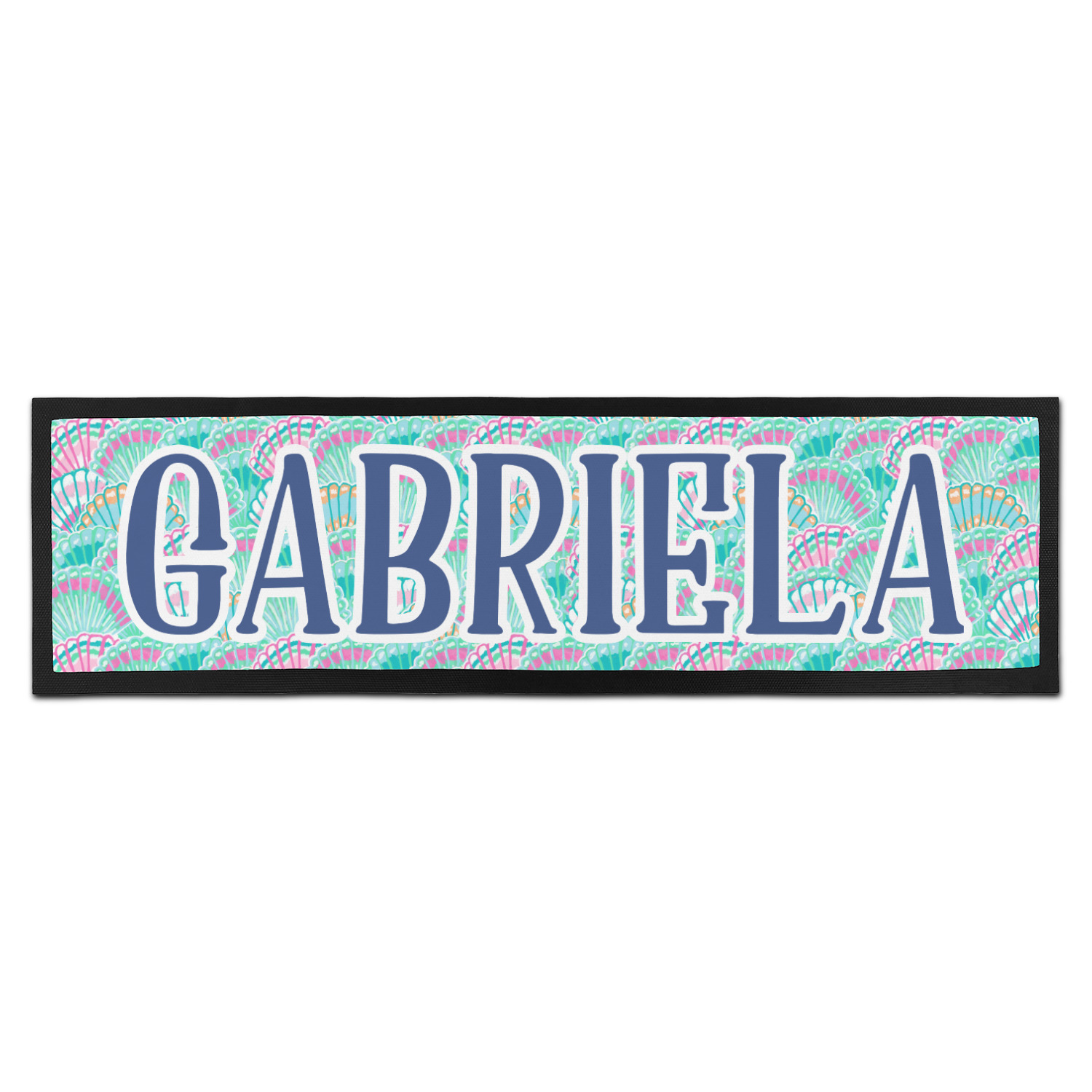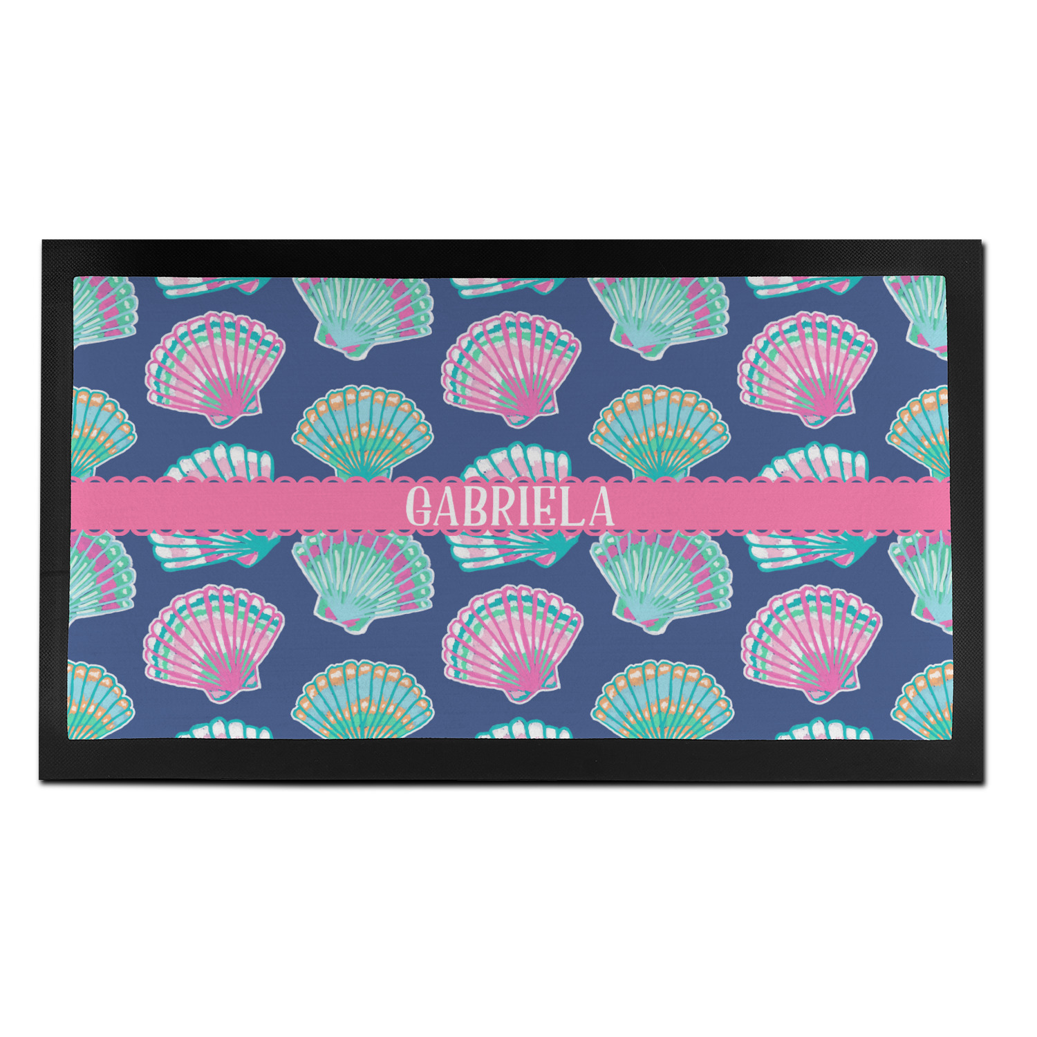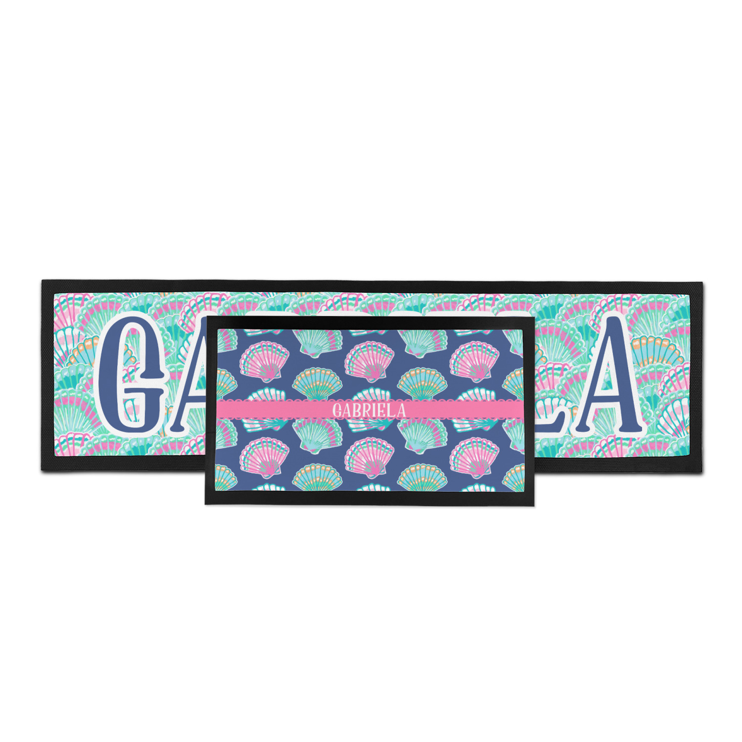 In this design, light pink and teal shells are randomly arranged on a blue background to create a stunning pattern. The main design uses a scalloped ribbon with a name for personalization. The coordinating pattern is filled with overlapping teal and pink shells.