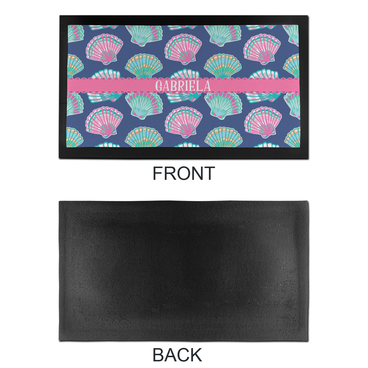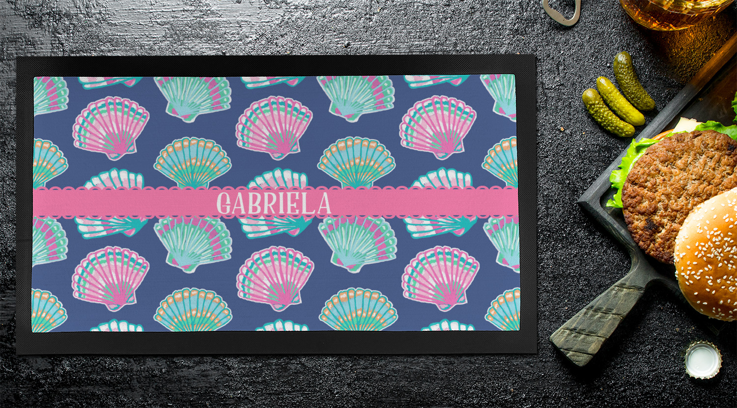In this design, light pink and teal shells are randomly arranged on a blue background to create a stunning pattern. The main design uses a scalloped ribbon with a name for personalization. The coordinating pattern is filled with overlapping teal and pink shells.