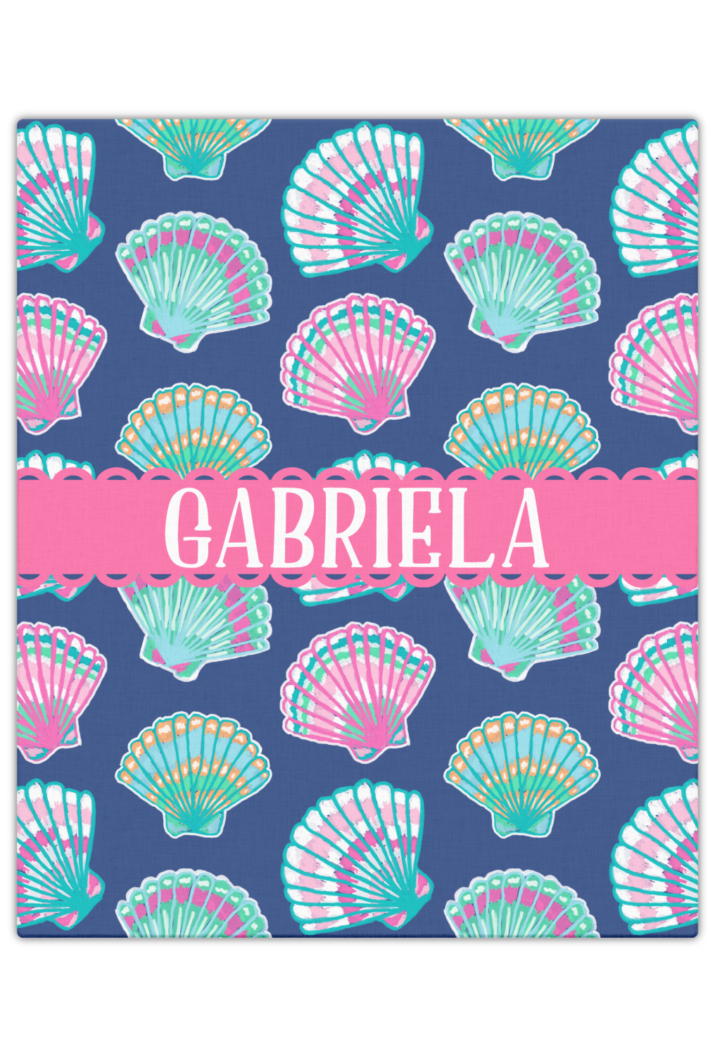 In this design, light pink and teal shells are randomly arranged on a blue background to create a stunning pattern. The main design uses a scalloped ribbon with a name for personalization. The coordinating pattern is filled with overlapping teal and pink shells.
