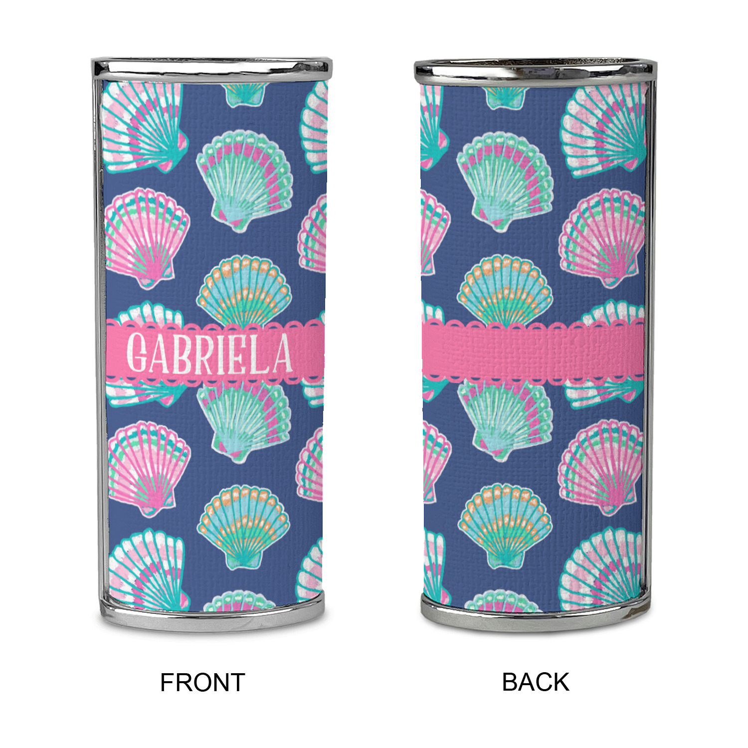 In this design, light pink and teal shells are randomly arranged on a blue background to create a stunning pattern. The main design uses a scalloped ribbon with a name for personalization. The coordinating pattern is filled with overlapping teal and pink shells.