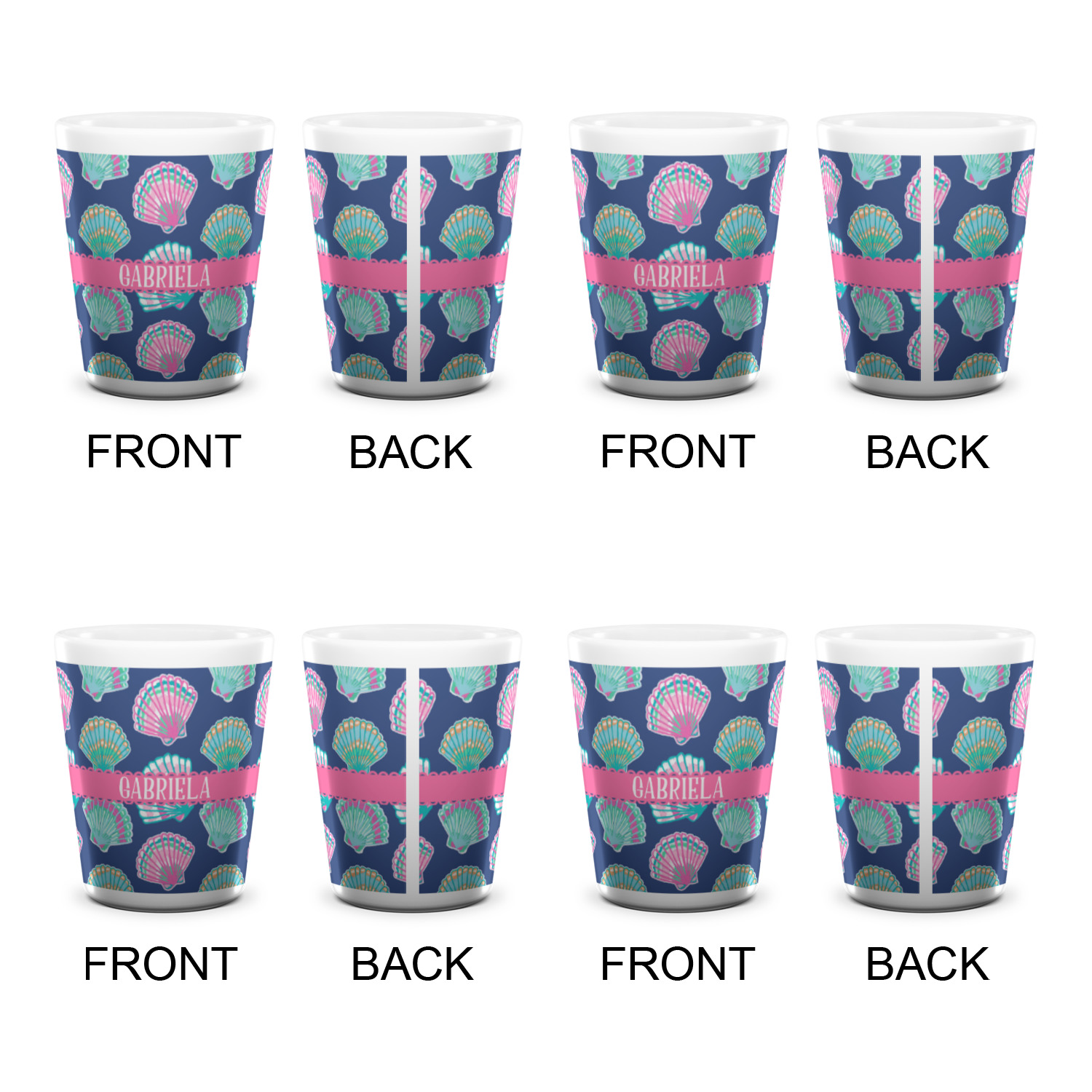 In this design, light pink and teal shells are randomly arranged on a blue background to create a stunning pattern. The main design uses a scalloped ribbon with a name for personalization. The coordinating pattern is filled with overlapping teal and pink shells.