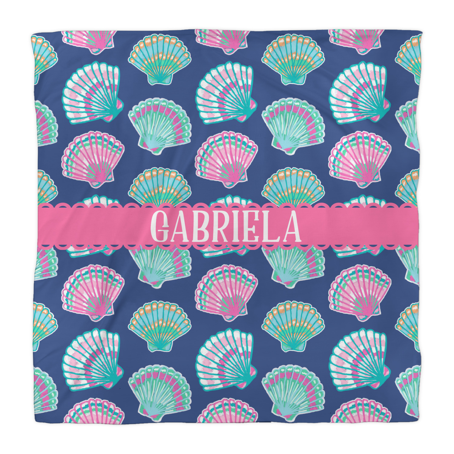 In this design, light pink and teal shells are randomly arranged on a blue background to create a stunning pattern. The main design uses a scalloped ribbon with a name for personalization. The coordinating pattern is filled with overlapping teal and pink shells.