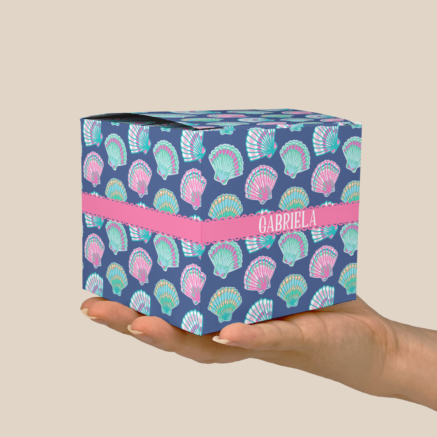 In this design, light pink and teal shells are randomly arranged on a blue background to create a stunning pattern. The main design uses a scalloped ribbon with a name for personalization. The coordinating pattern is filled with overlapping teal and pink shells.