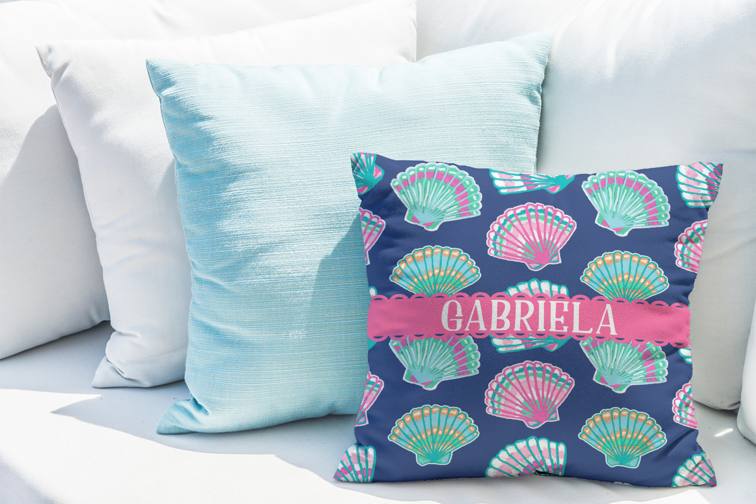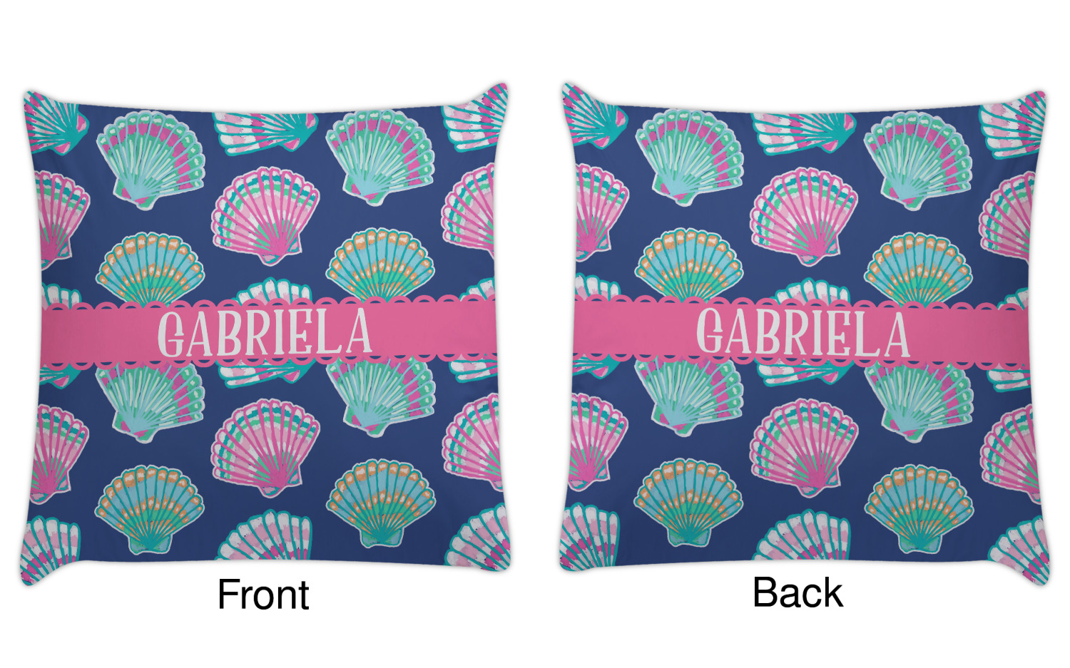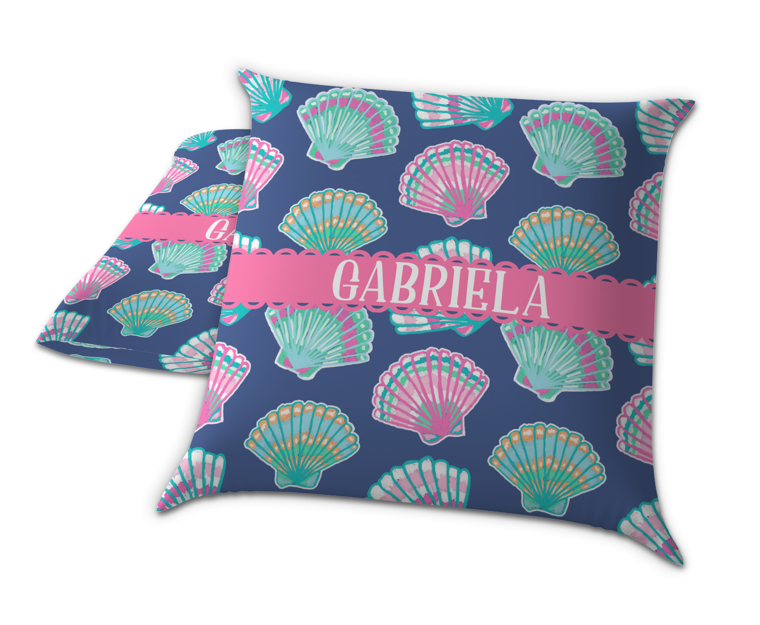 In this design, light pink and teal shells are randomly arranged on a blue background to create a stunning pattern. The main design uses a scalloped ribbon with a name for personalization. The coordinating pattern is filled with overlapping teal and pink shells.