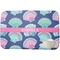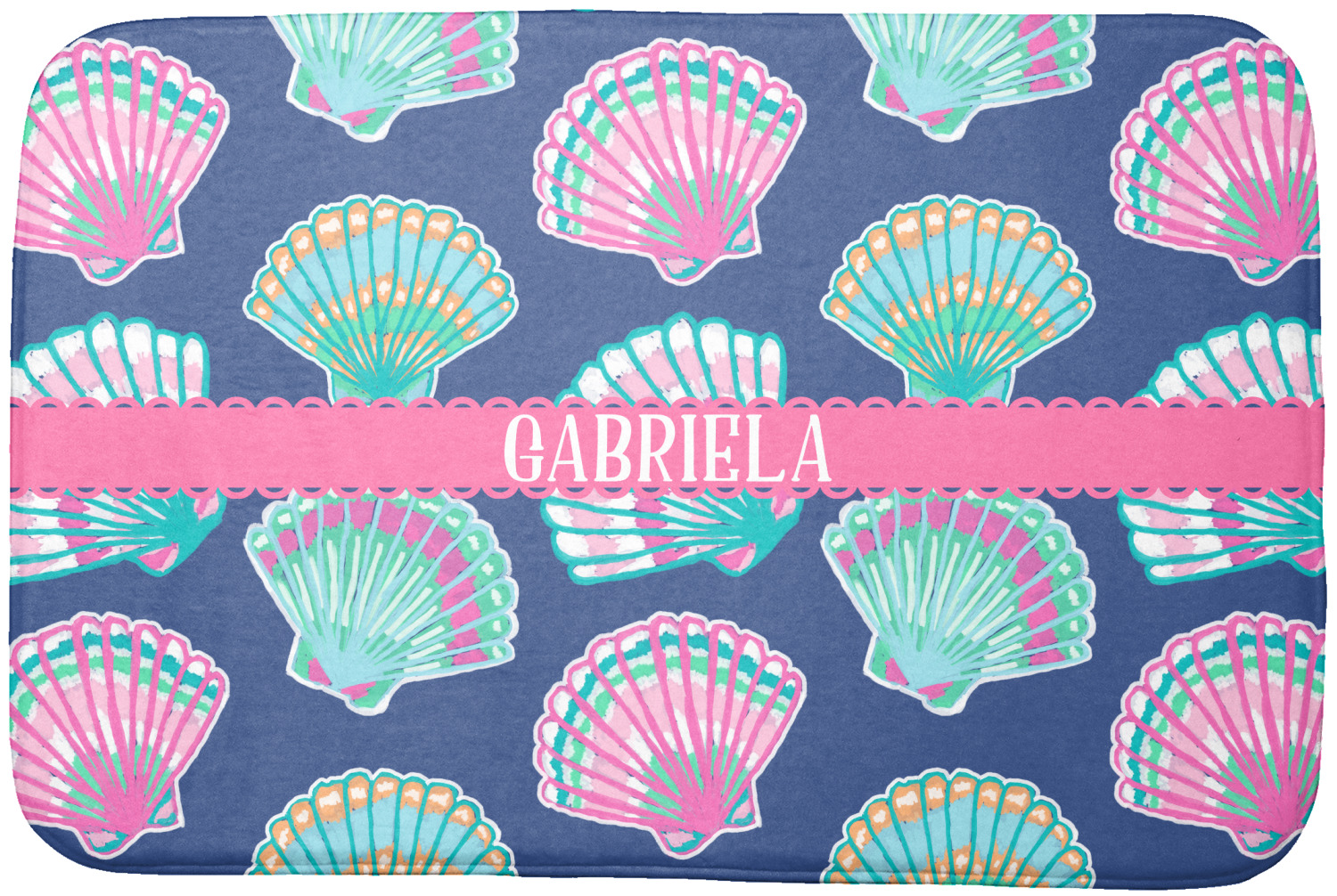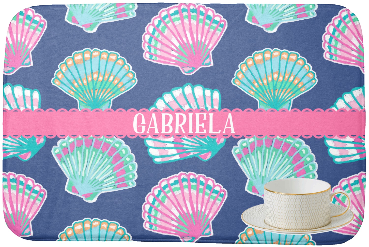 In this design, light pink and teal shells are randomly arranged on a blue background to create a stunning pattern. The main design uses a scalloped ribbon with a name for personalization. The coordinating pattern is filled with overlapping teal and pink shells.