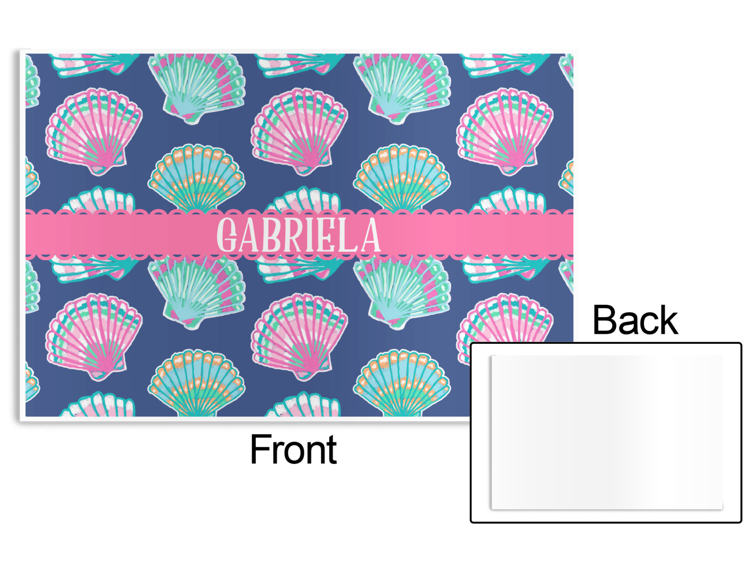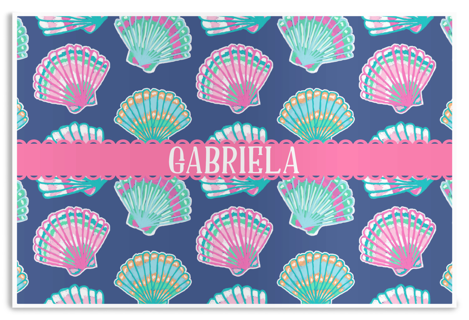 In this design, light pink and teal shells are randomly arranged on a blue background to create a stunning pattern. The main design uses a scalloped ribbon with a name for personalization. The coordinating pattern is filled with overlapping teal and pink shells.