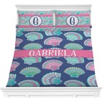 In this design, light pink and teal shells are randomly arranged on a blue background to create a stunning pattern. The main design uses a scalloped ribbon with a name for personalization. The coordinating pattern is filled with overlapping teal and pink shells.