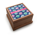 In this design, light pink and teal shells are randomly arranged on a blue background to create a stunning pattern. The main design uses a scalloped ribbon with a name for personalization. The coordinating pattern is filled with overlapping teal and pink shells.