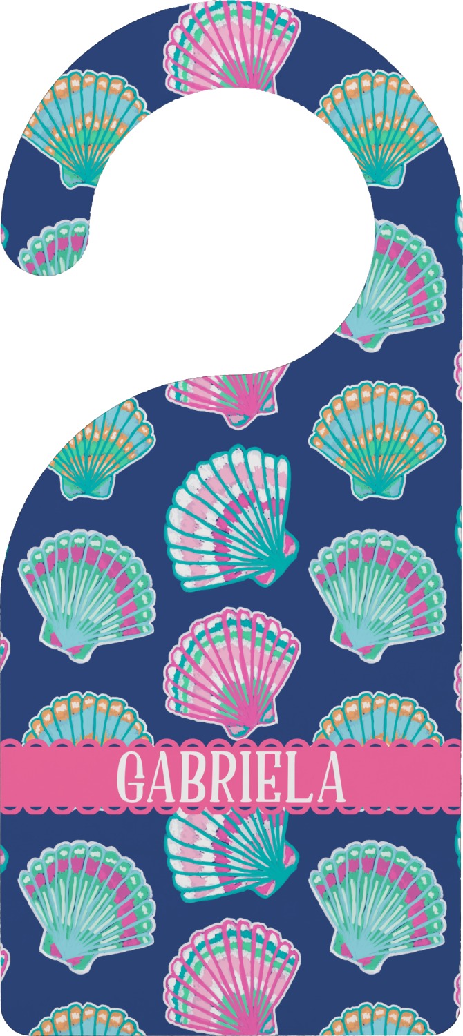 In this design, light pink and teal shells are randomly arranged on a blue background to create a stunning pattern. The main design uses a scalloped ribbon with a name for personalization. The coordinating pattern is filled with overlapping teal and pink shells.