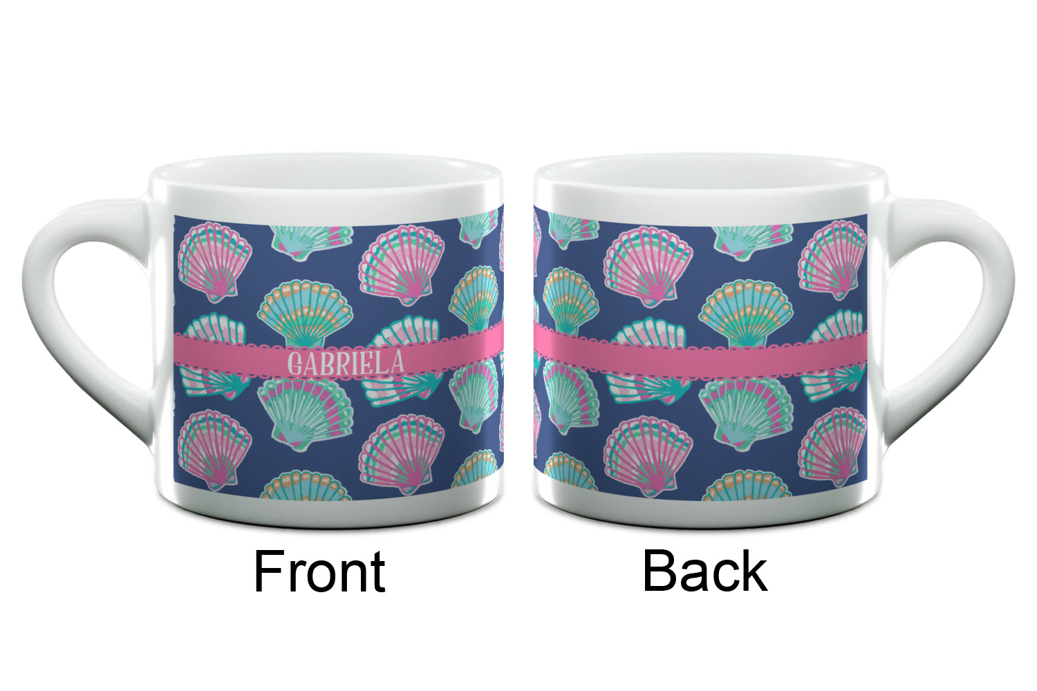 In this design, light pink and teal shells are randomly arranged on a blue background to create a stunning pattern. The main design uses a scalloped ribbon with a name for personalization. The coordinating pattern is filled with overlapping teal and pink shells.