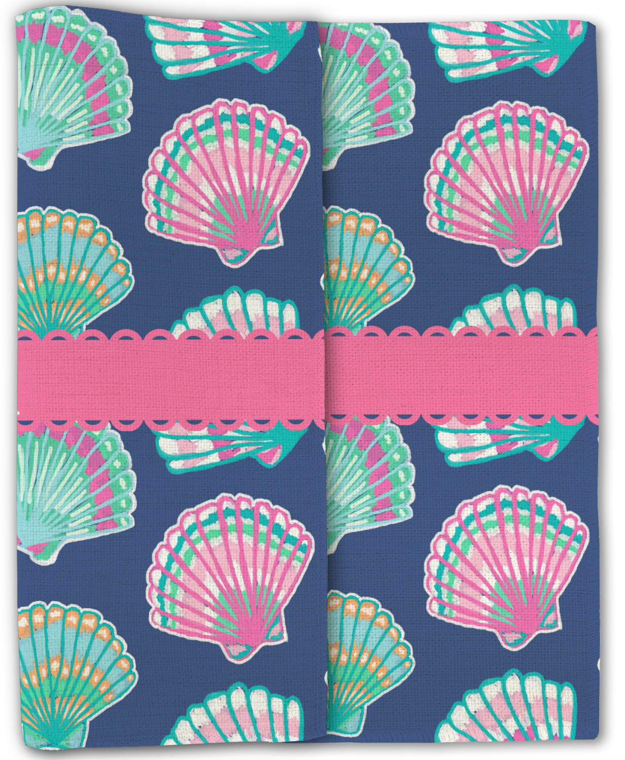 In this design, light pink and teal shells are randomly arranged on a blue background to create a stunning pattern. The main design uses a scalloped ribbon with a name for personalization. The coordinating pattern is filled with overlapping teal and pink shells.