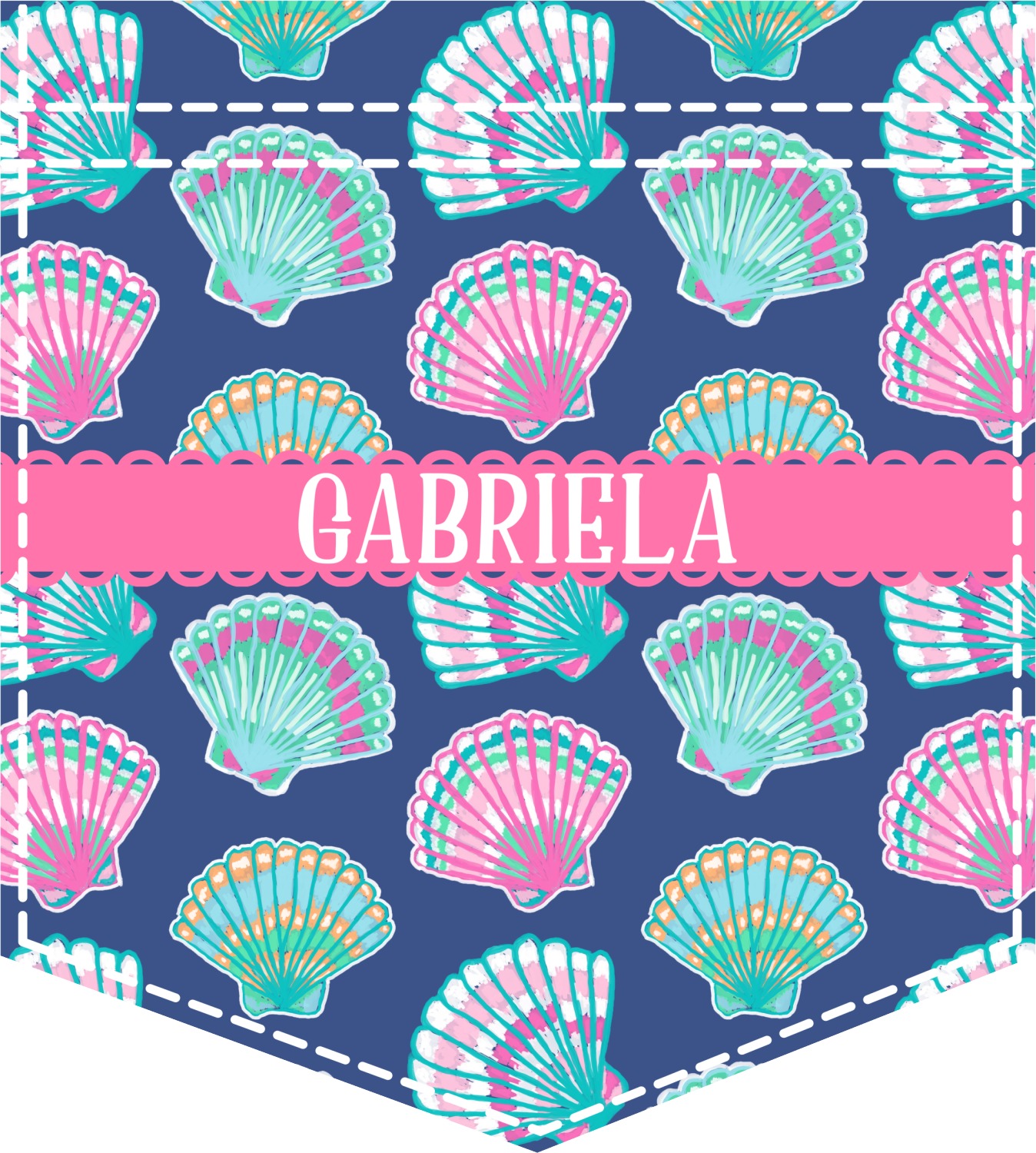 In this design, light pink and teal shells are randomly arranged on a blue background to create a stunning pattern. The main design uses a scalloped ribbon with a name for personalization. The coordinating pattern is filled with overlapping teal and pink shells.