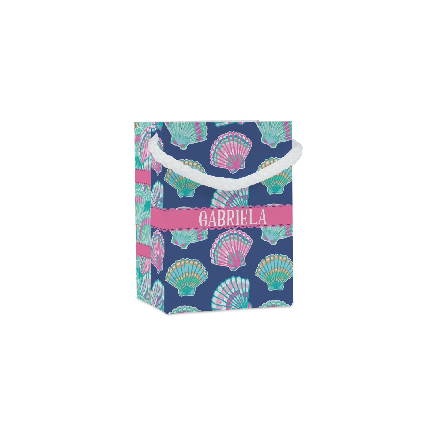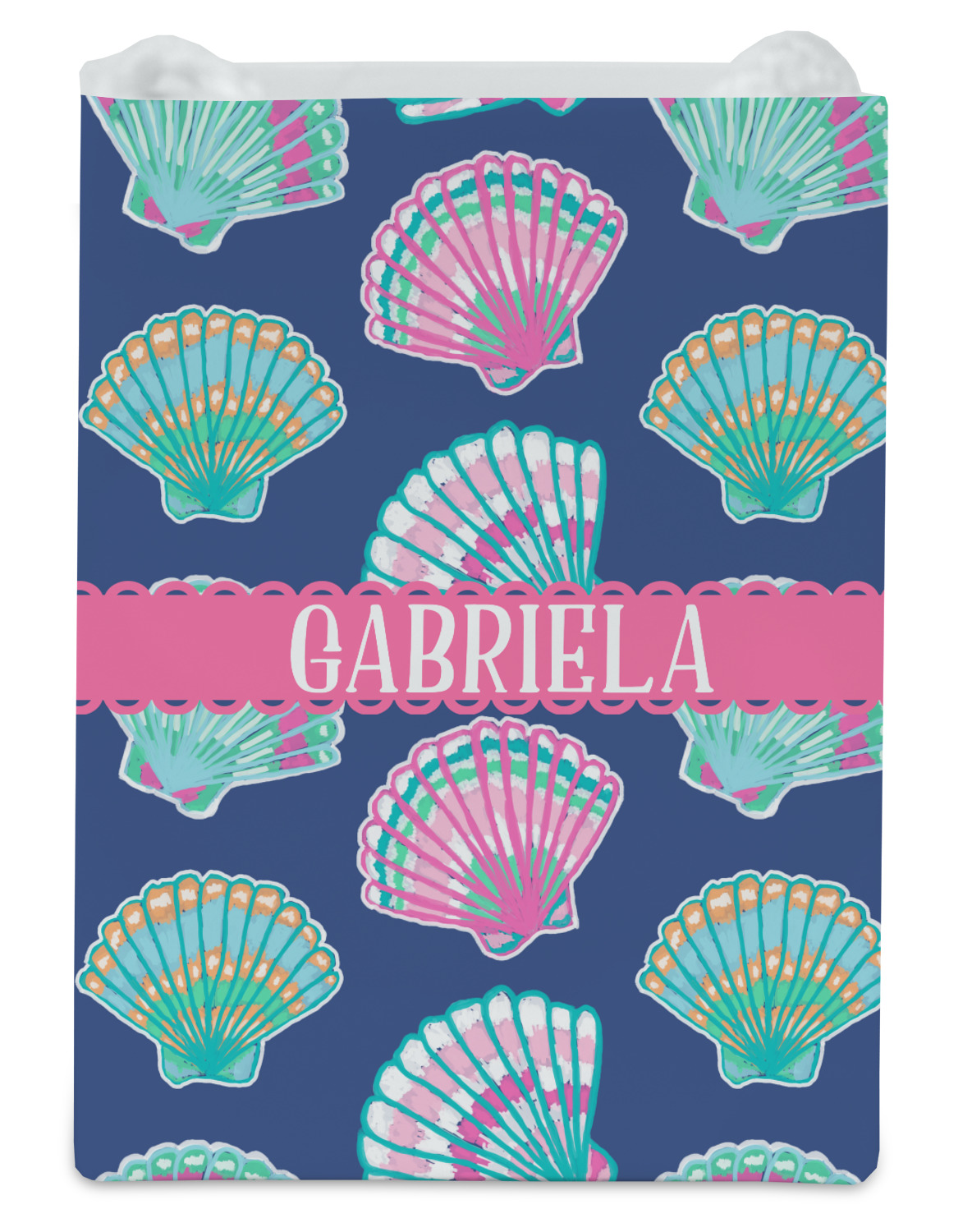In this design, light pink and teal shells are randomly arranged on a blue background to create a stunning pattern. The main design uses a scalloped ribbon with a name for personalization. The coordinating pattern is filled with overlapping teal and pink shells.