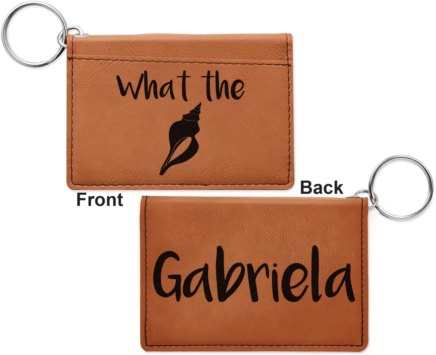 These ID wallet keychains features three pockets on the inside to accommodate your ID and your most frequently used cards. Another pocket occupies the front of the wallet's exterior, and can hold some cash or another card. The wallet is accompanied by a thick metal ring for easy attachment to a belt clip or purse. Each card holder keychain measures at 4.25 by 3 inches and is a beautiful, cognac, medium-brown shade. The personalized monogram, font, or graphic of your choosing is laser engraved into the surface of the wallet, creating a black imprint. We sell these ID wallets in two models: single sided and double sided engraving.