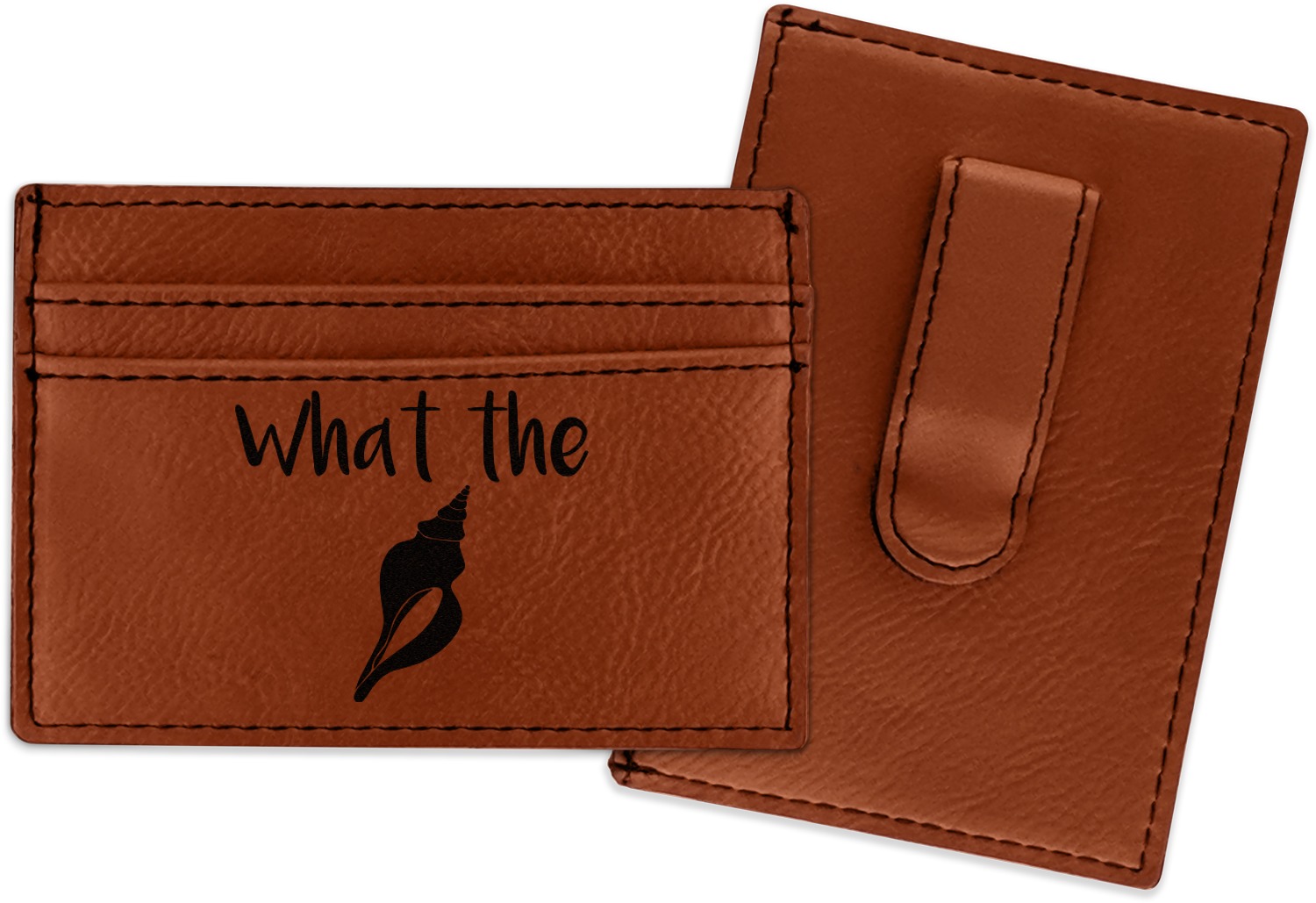Made from a smooth brown leatherette material, these money clip wallets are the perfect accessory. They measure at approximately 4" x 2.75". On one side there is a money clip where you can slip in your cash. On the other side are three card slots for an ID and credit card or two. The money clip wallet will be laser engraved with your design on the side with the credit card slots. The graphic will come out as a black color.