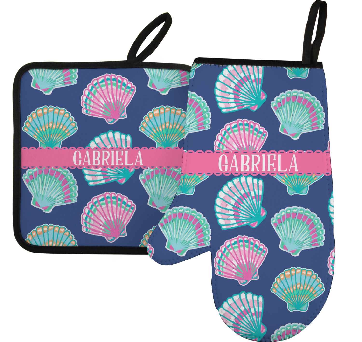 In this design, light pink and teal shells are randomly arranged on a blue background to create a stunning pattern. The main design uses a scalloped ribbon with a name for personalization. The coordinating pattern is filled with overlapping teal and pink shells.