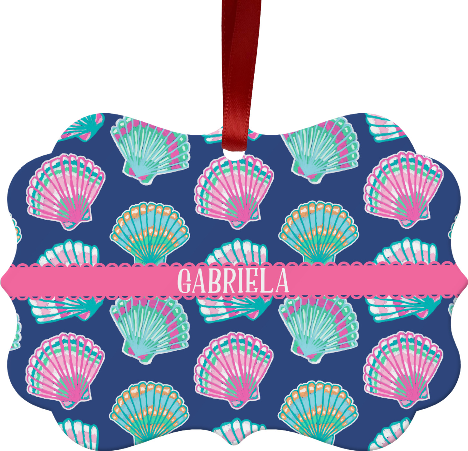 In this design, light pink and teal shells are randomly arranged on a blue background to create a stunning pattern. The main design uses a scalloped ribbon with a name for personalization. The coordinating pattern is filled with overlapping teal and pink shells.