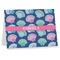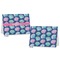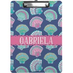 In this design, light pink and teal shells are randomly arranged on a blue background to create a stunning pattern. The main design uses a scalloped ribbon with a name for personalization. The coordinating pattern is filled with overlapping teal and pink shells.
