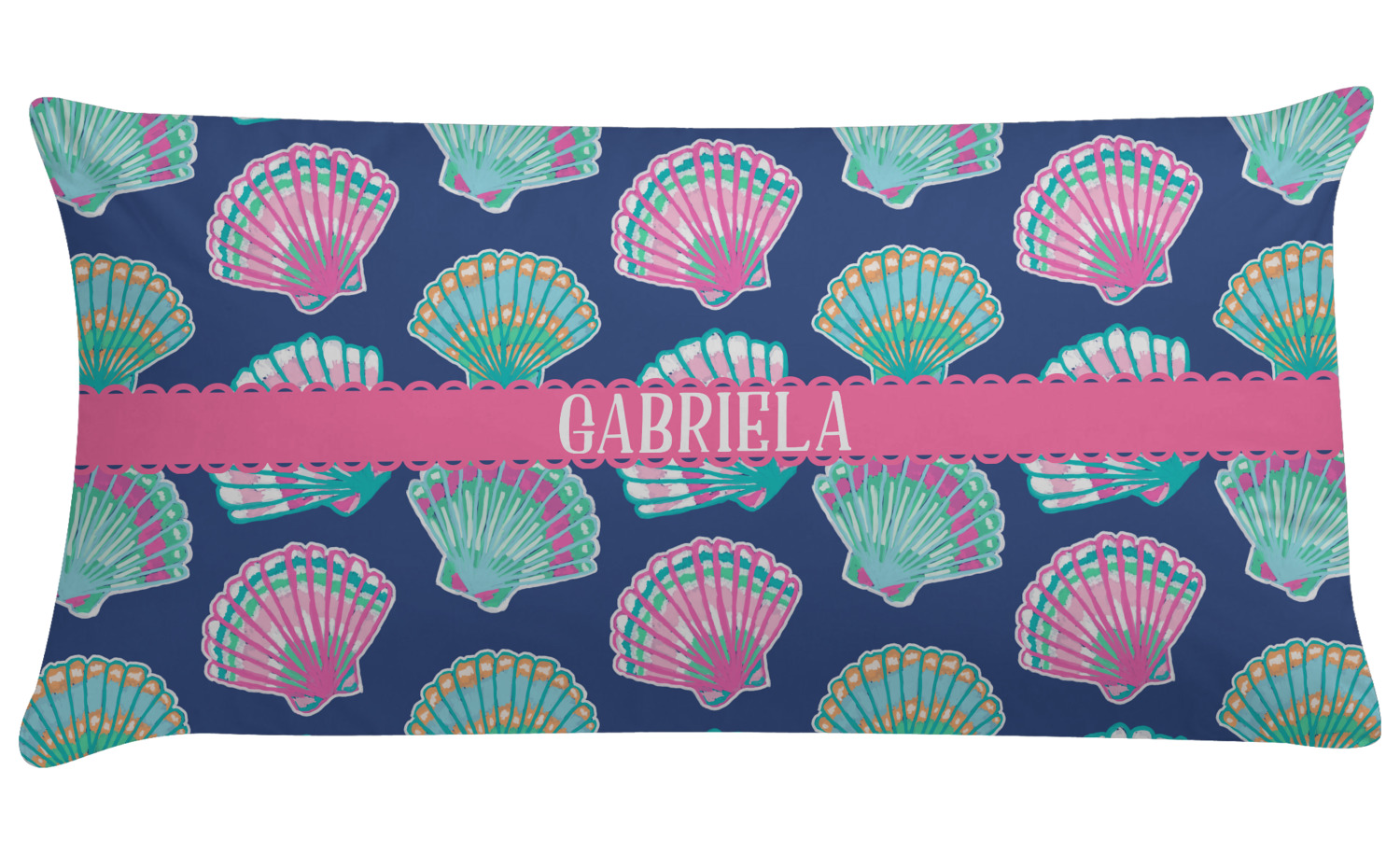 In this design, light pink and teal shells are randomly arranged on a blue background to create a stunning pattern. The main design uses a scalloped ribbon with a name for personalization. The coordinating pattern is filled with overlapping teal and pink shells.