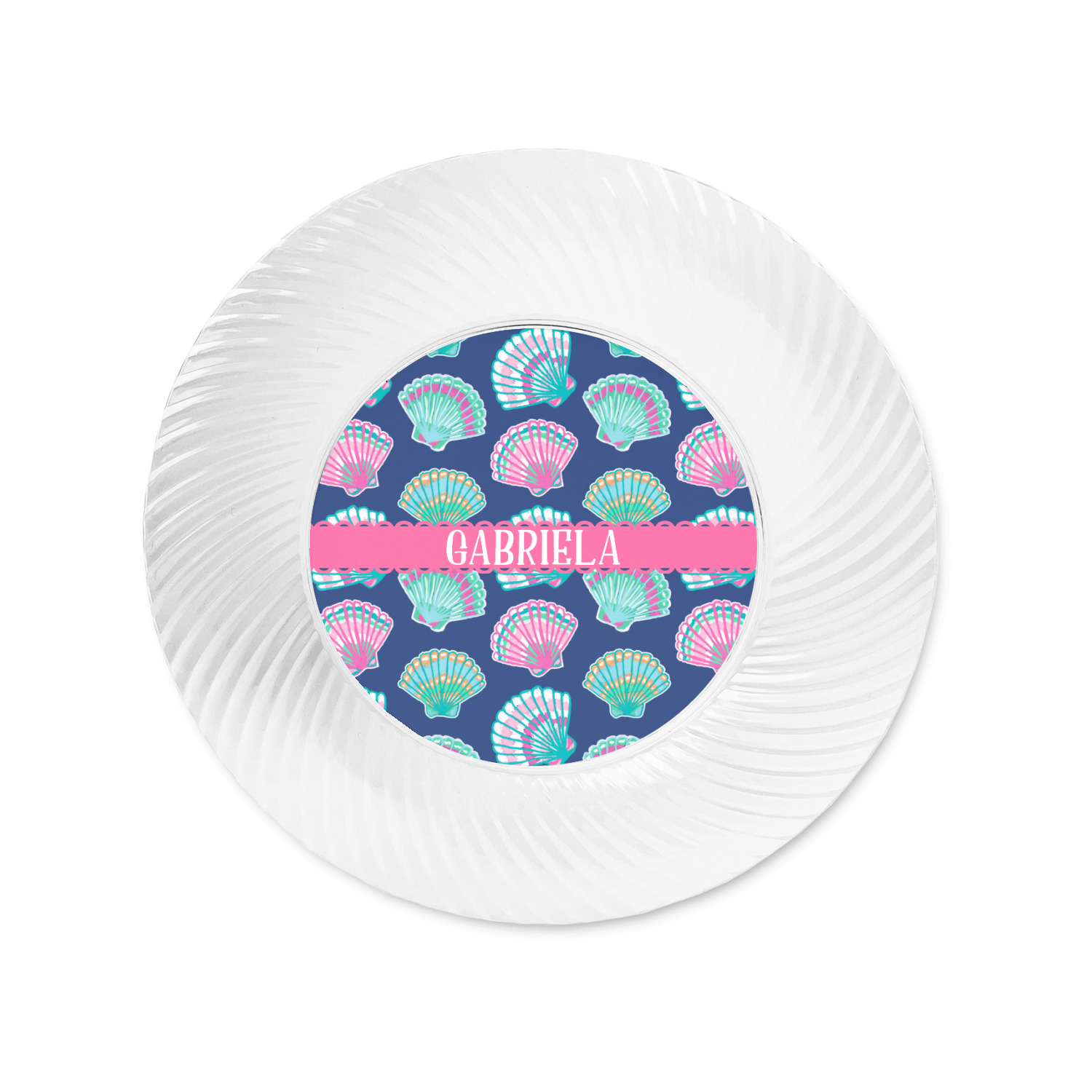 In this design, light pink and teal shells are randomly arranged on a blue background to create a stunning pattern. The main design uses a scalloped ribbon with a name for personalization. The coordinating pattern is filled with overlapping teal and pink shells.