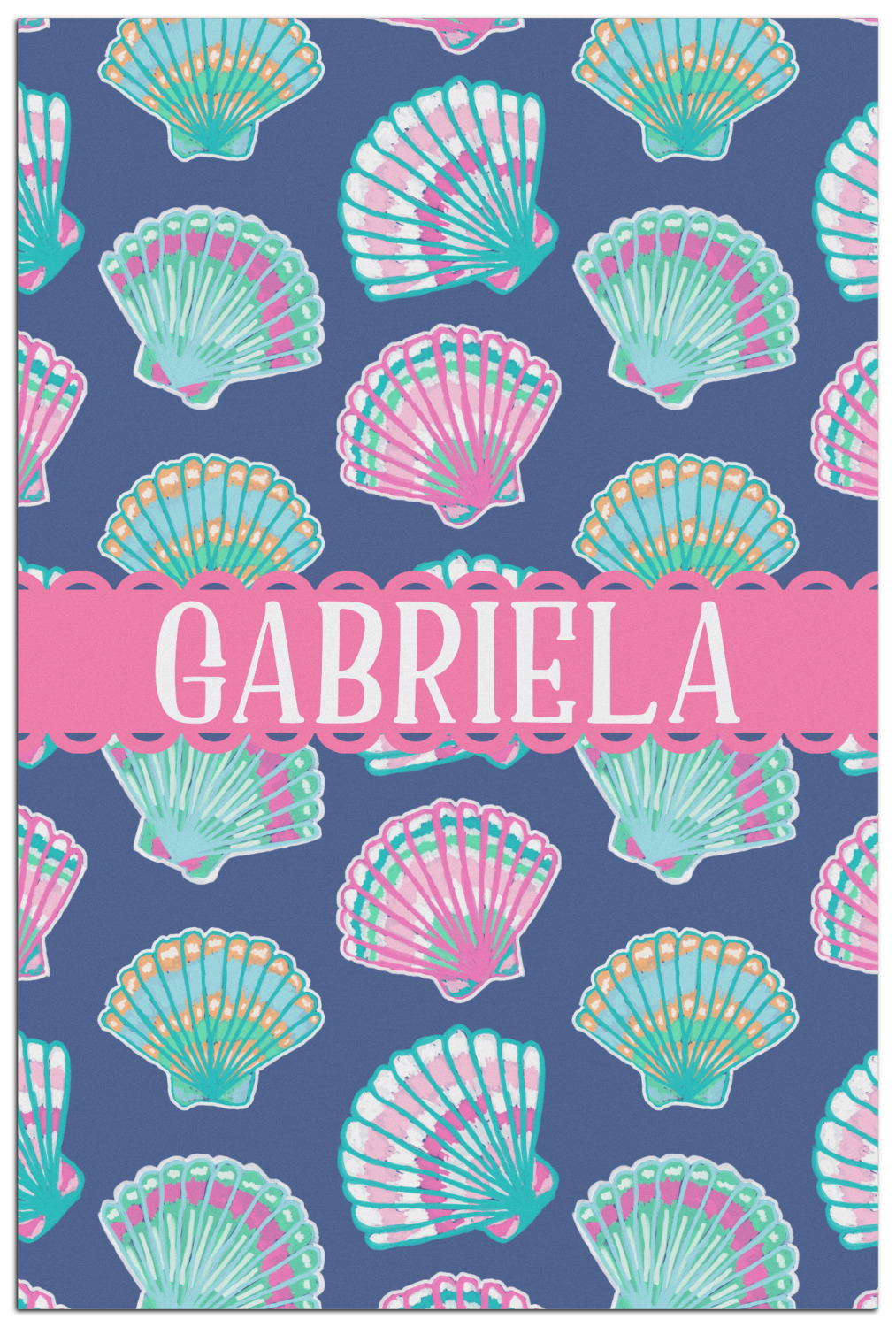 In this design, light pink and teal shells are randomly arranged on a blue background to create a stunning pattern. The main design uses a scalloped ribbon with a name for personalization. The coordinating pattern is filled with overlapping teal and pink shells.