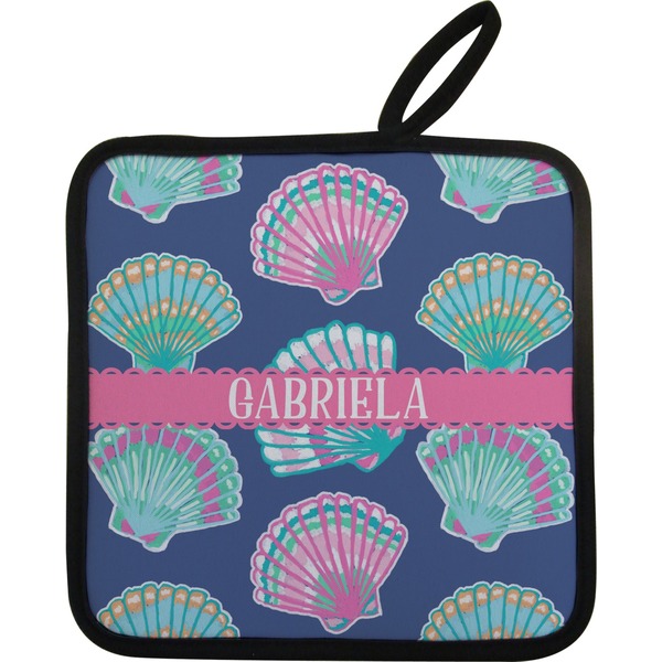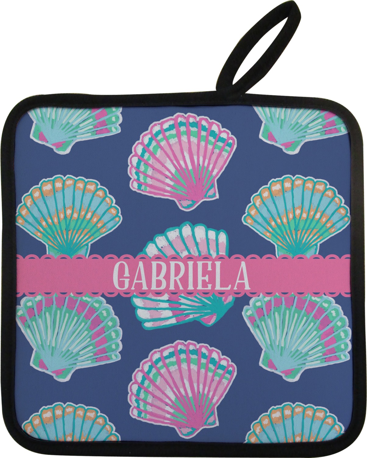 Our personalized pot holders feature a neoprene front that displays your personalization in vibrant colors. The backing of the hot pot holder is rubberized; the textured backing allows you to have a great grip when using this custom pot holder. The two materials are joined with a sleek, black trim, and the holder also includes an attached loop for hanging and storage. The pot holder is approximately 8.75 inches by 8.75 inches and 0.25 inches tall, while the fabric loop is 2.5 inches long. You can purchase a kitchen pot holder by itself or as a set of 2. We also offer a set including one pot holder and one oven mitt.