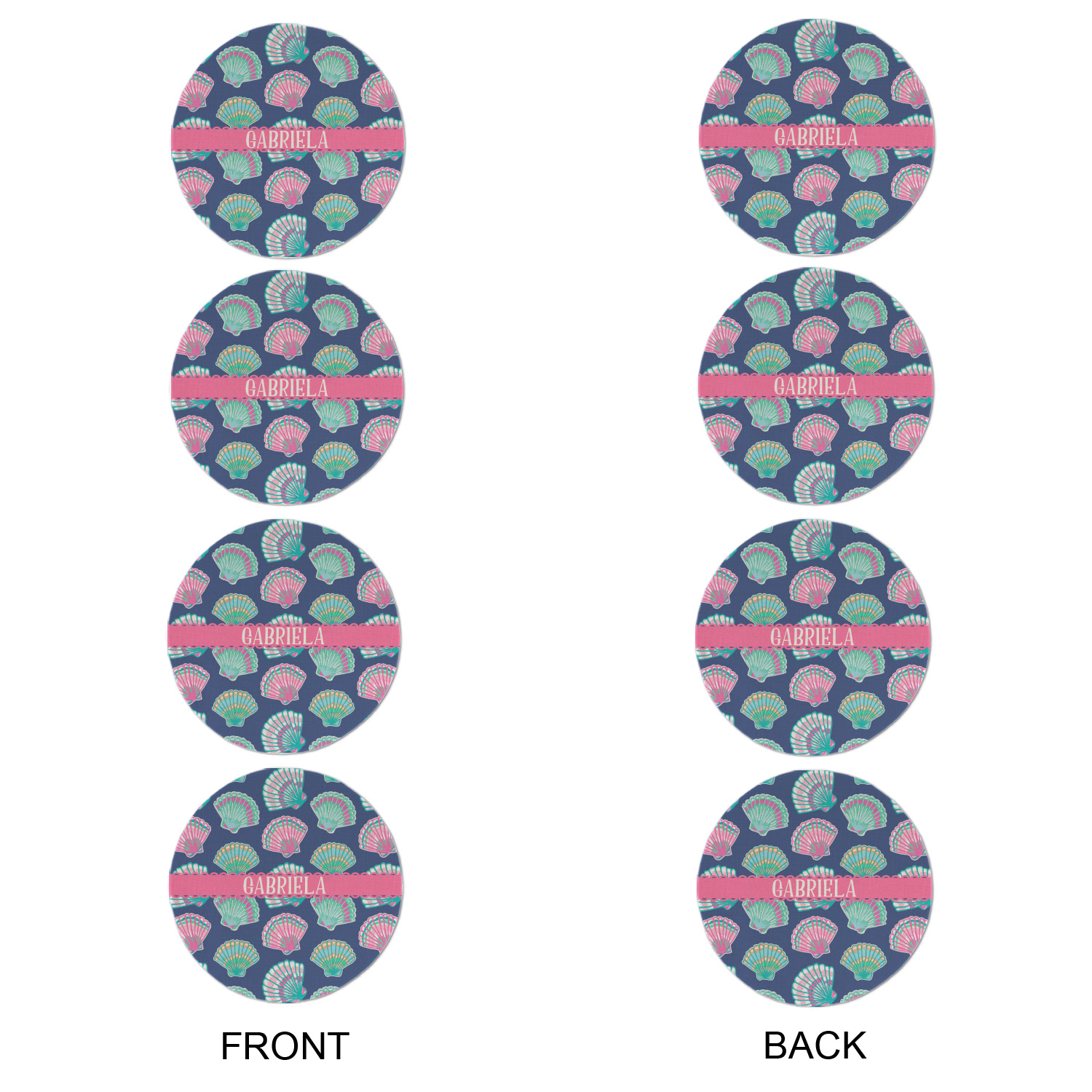In this design, light pink and teal shells are randomly arranged on a blue background to create a stunning pattern. The main design uses a scalloped ribbon with a name for personalization. The coordinating pattern is filled with overlapping teal and pink shells.