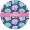 In this design, light pink and teal shells are randomly arranged on a blue background to create a stunning pattern. The main design uses a scalloped ribbon with a name for personalization. The coordinating pattern is filled with overlapping teal and pink shells.